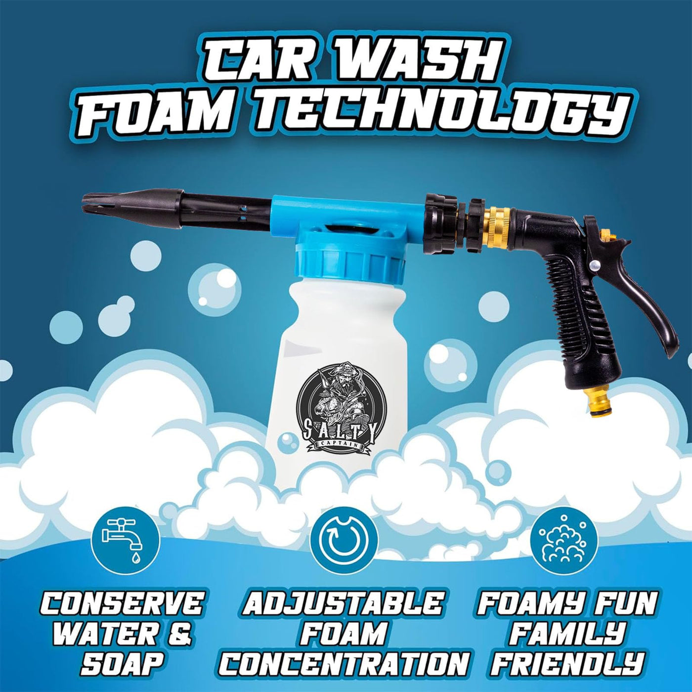 Introducing the Salty Captain Foam Cannon Cleaner - the ultimate solution for hassle-free car cleaning! Say goodbye to the old bucket and sponge system and hello to a professional-grade clean with our hose nozzle foam blaster. Our foam cannon car cleaner is designed to make car cleaning a breeze. With its universal hose attachments connection compatibility, you won't need any additional adapter or tools to connect it to your hose. Plus, the adjustable foam concentration switch allows you to tailor your wash to the level of dirt on your vehicle, ensuring optimal foam consistency for every wash. But that's not all - our foam blaster also helps prevent swirls and scratches on your paintwork. Over 95% of paint swirls and scratches are caused by improper washing techniques, but our slick foam solution minimizes these risks, safeguarding your vehicle's or vessel's finish. The Salt Captain Foam Cannon is also ideal for a wide range of vehicles, including cars, boats, jet skis, and RVs. Providing a deep clean that enhances the appearance and longevity of your investment. Not just for adults - our foamy fun for everyone feature makes it a fun way to clean the car or vehicle/vessel for the whole family. Our foam blaster is also eco-friendly. The adjustable concentration feature allows for efficient use of soap and water, making it a great choice for routine cleaning. Plus, it can be used with any concentrated cleaning detergents to treat your vehicle in no time. Our SaltyCaptain Foam washers the detailer's choice for achieving a professional-quality, scratch-free shine. It's plug & play, comes with everything you need (except suds)to connect to your garden hose, and is the perfect solution for anyone who wants to conserve resources while achieving a top-notch clean. Order yours today and experience the difference! Use our cleaning gun to rinse salt away froom your vessel too. It can be used as a Boat cleaner and jetksi salt wash after a day on the waves.