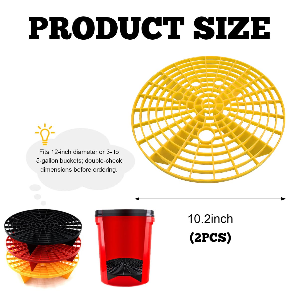Specification: Material: Plastic Quantity: 2 PCS Color: Black+Red/ Red/ Black/ Yellow/ Blue Weight: 0.77 lb Size: 10.2 10.2 inches Feature: Durable, Practical, Filterable Fit Type: Universal Fit More information about the product: -It is lightweight and small, easy for you to carry and use. -It effectively filters debris from the water and improves the efficiency of the car wash. -It locks firmly to the bottom of the wash bucket, making grit hard to float up.