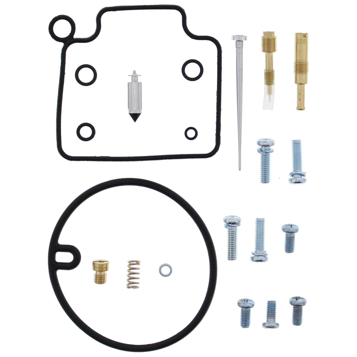 Q: What components are included in the carburetor rebuild kit?A: The kit includes all necessary O-rings, gaskets, jets, a needle, a mixture screw, float bowl screws, and a float valve needle and seat. Please note that the needle jet and other pressed-in jets are not included.