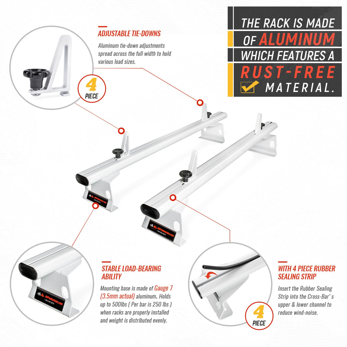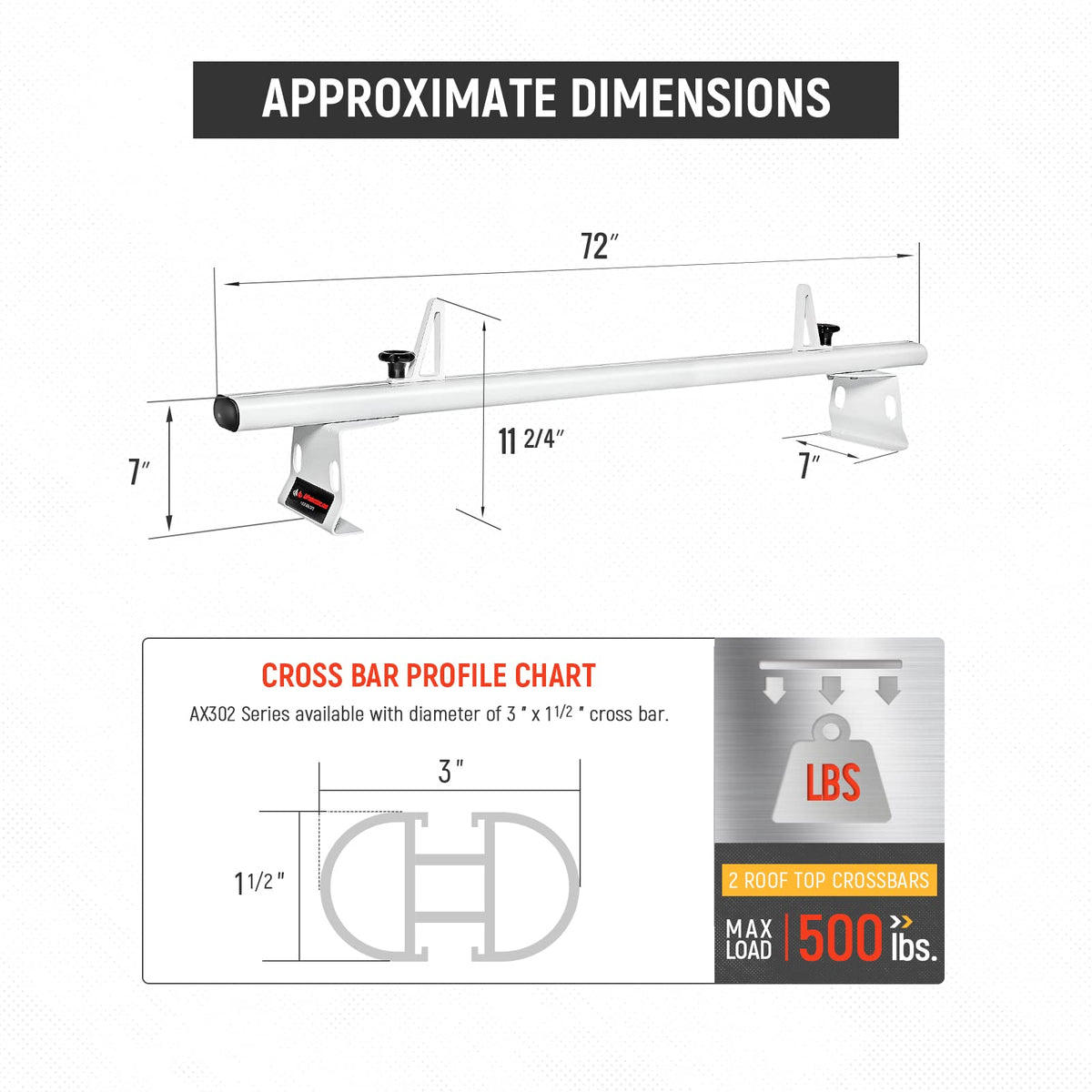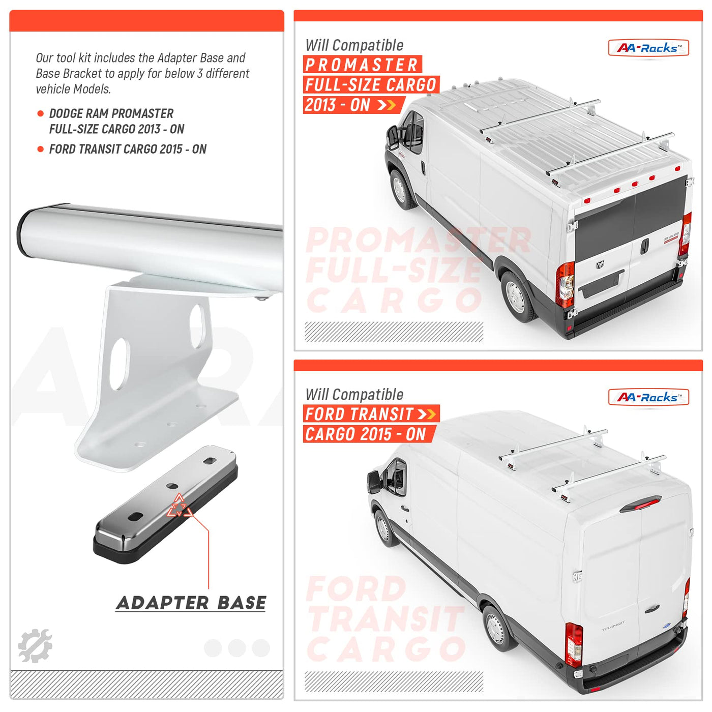 Fitment Vehicle: RAM ProMaster 2013-On Transit 2015-On Please Note: Hardware package vary by vehicle type, Verify that you have received the correct parts using attached Installation Instructions. The AA-Racks AX302 series is a universal roof-rack system which requires no drilling for installation. The rack is made of aluminum which features a Rust-Free material & Heavy-Duty purposed. Hardware package comes with Stainless Steel made bolts, nuts & washers; a pair of ladder stopper comes standard with each bar set. Ready for installation. Ready for installation.The maximum load capacity (Per bar) is 250 lbs.