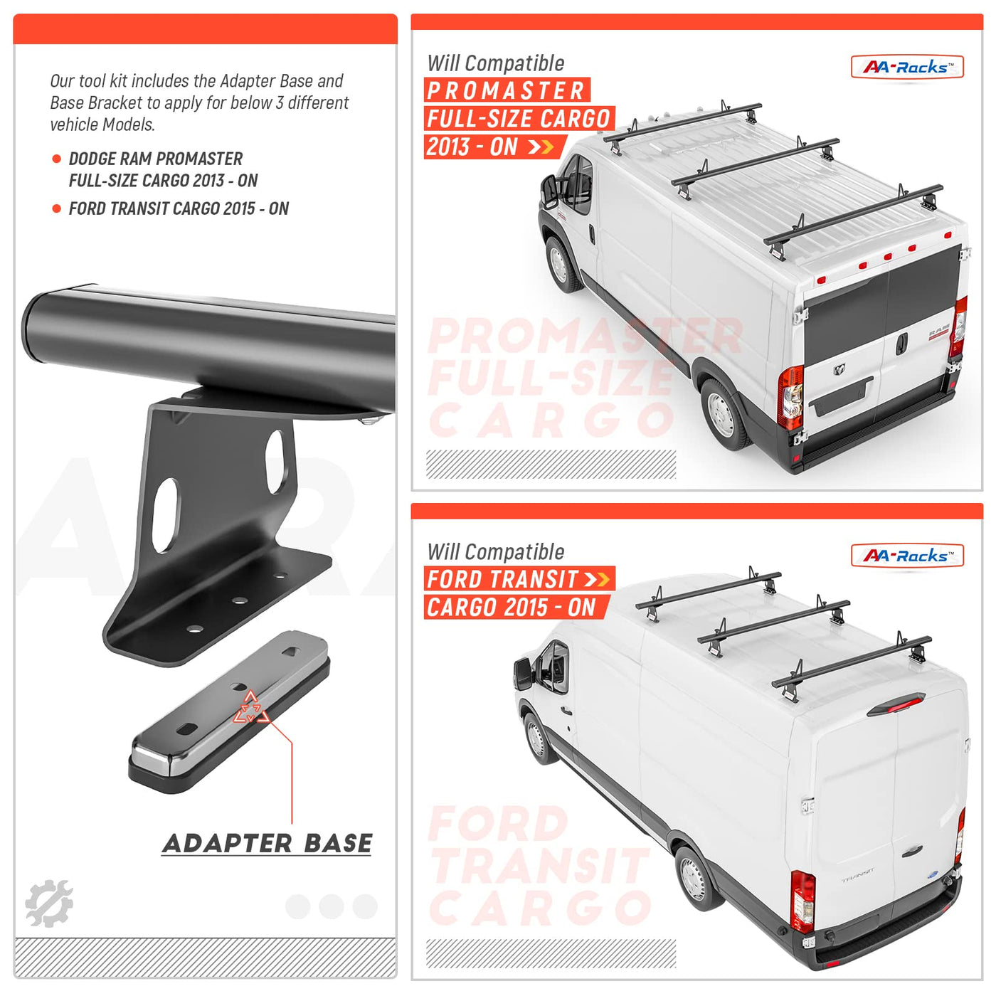 Q: What vehicles are compatible with the AA Racks Model AX302 roof rack?A: The AA Racks Model AX302 roof rack is designed to fit RAM ProMaster models from 2013 onward and Transit models from 2015 onward.