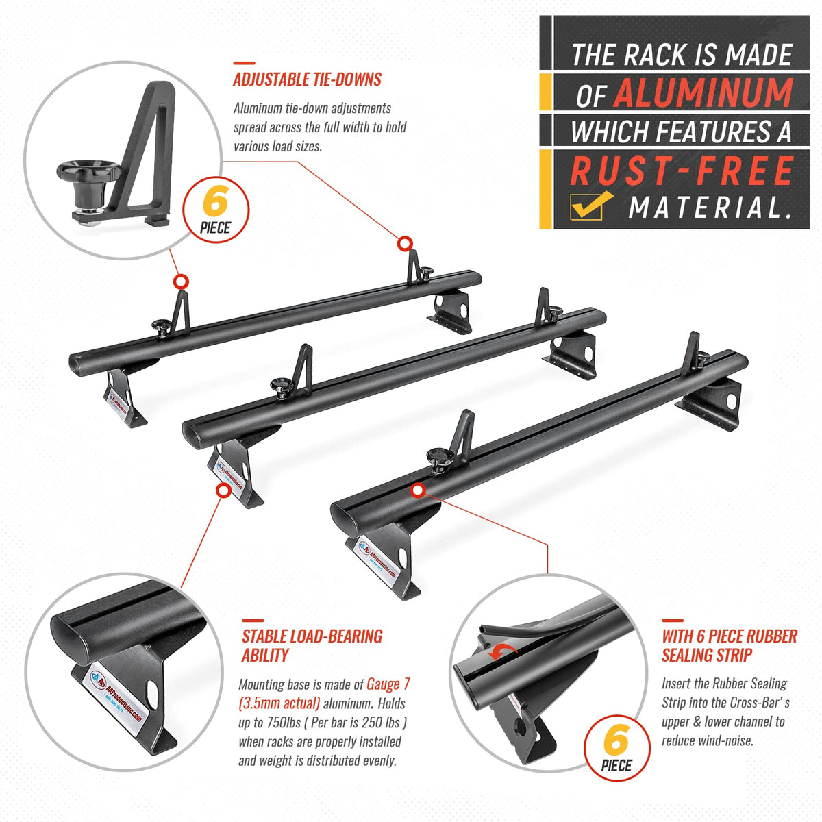 Q: What materials are used in the construction of the AA Racks roof rack?A: The roof rack is made from extruded aluminum, providing a rust-free and heavy-duty solution for your cargo needs. Stainless steel hardware is included for added strength and durability.