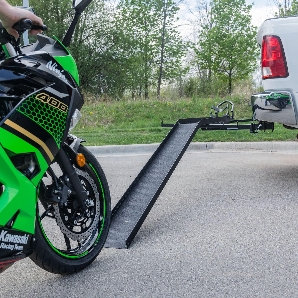 Easily transport your motorcycle, electric bike, or fat tire bike without a bulky trailer or specialized carrier using the Black Widow Carrier. Designed for Class III or IV 2-inch hitch receivers, this motorcycle carrier offers a simple and secure way to haul your bike wherever you go. Made from powder-coated 14-gauge steel with grit-coat ramp and track traction, this rack is highly durable, supporting up to 600 pounds. Whether you're heading to the trails or commuting with your electric bike, this hitch-mounted solution is built for convenience and reliability. Loading and unloading is effortless with the included roll-on, roll-off ramp, which should be installed on the right side of the carrier. When not in use, the 98-pound ramp can be stored on the carrier when not in use for compact storage. Designed for wheels up to 7.25 inches wide, this carrier easily accommodates motorcycles, dirt bikes, and scooters. For added safety, tie-down straps (sold separately) can be used to further secure your load. Please note, 200mm tires are not compatible with the track width of this carrier. To ensure stability during transport, the carrier includes a 5/8-inch hitch pin, an anti-rattle device that minimizes movement, and a built-in adjustable wheel chock. This helps keep your bike secure even on rough roads. With its rugged construction, user-friendly ramp system, and secure hitch-mounted design, this Black Widow Carrier is the ultimate solution for transporting your powersport bike.
