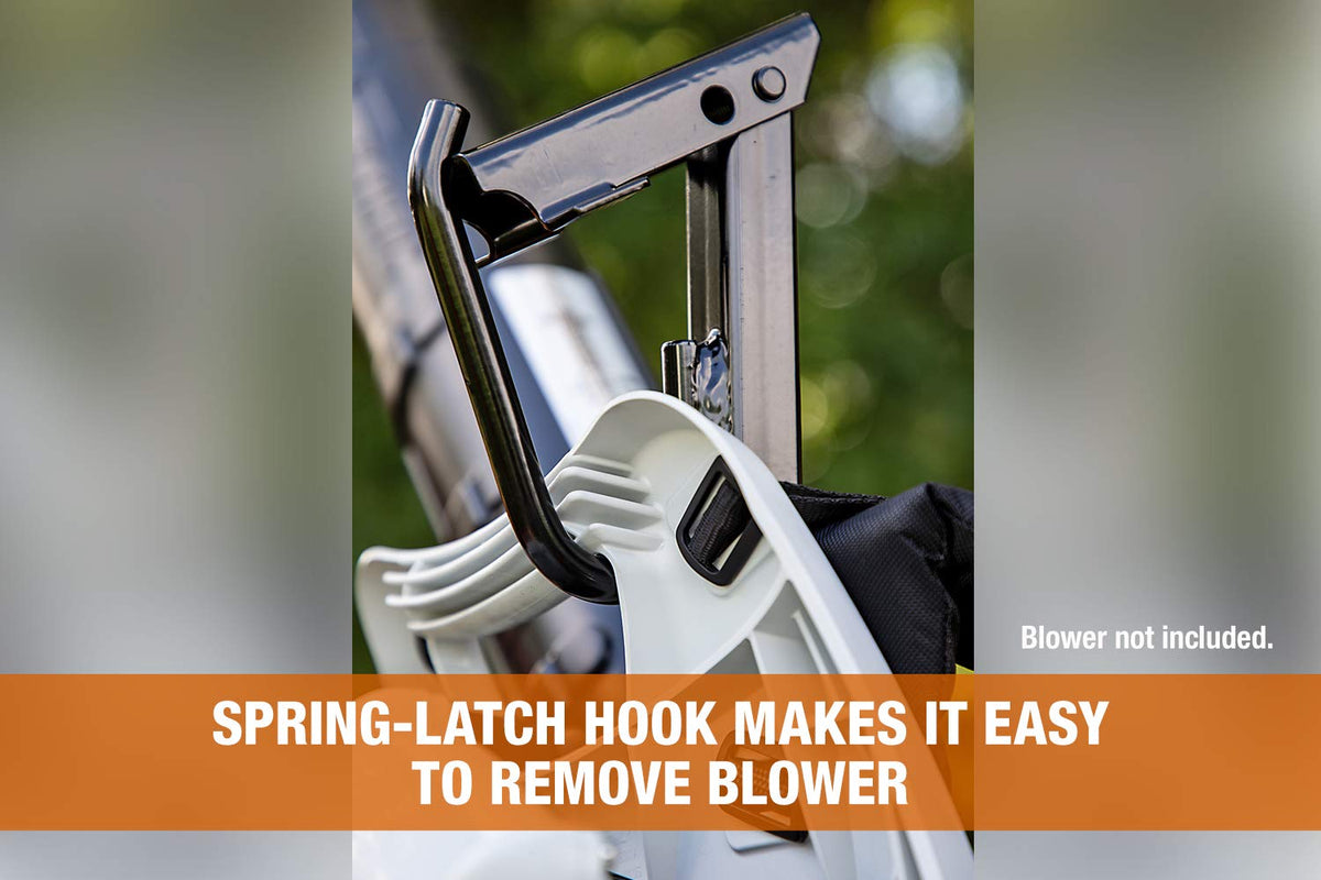 Q: How does the spring latch hook work for securing the blower?A: The spring latch hook quickly secures your backpack blower in place, preventing it from shifting during transport. This design, combined with rubber straps, provides stability and ensures safety while on the road.