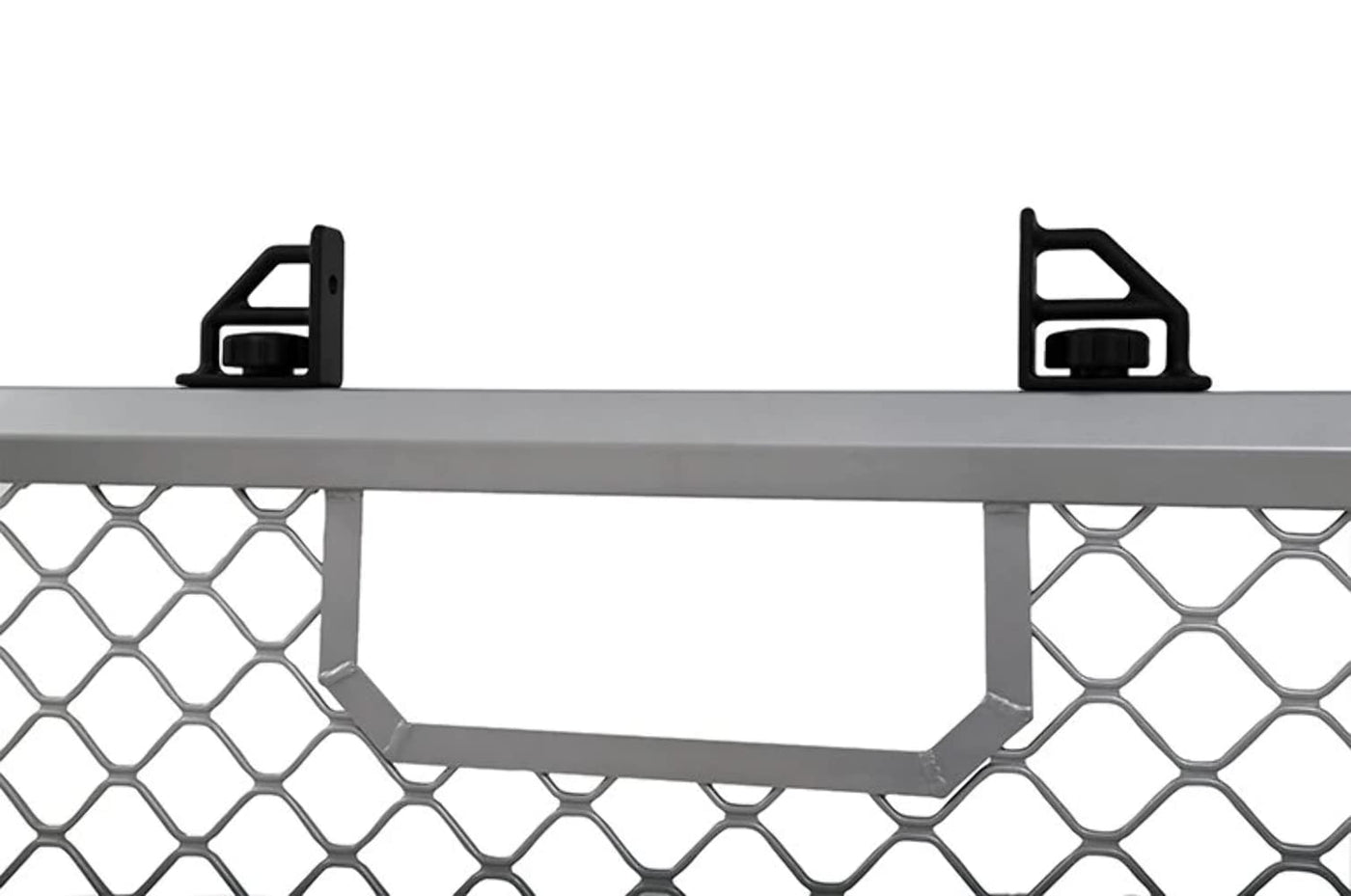Q: How does the heavy-duty aluminum ultra mesh provide protection?A: The heavy-duty aluminum ultra mesh offers enhanced visibility while providing protection for the rear window of the cab area. This mesh is designed to withstand rugged conditions.