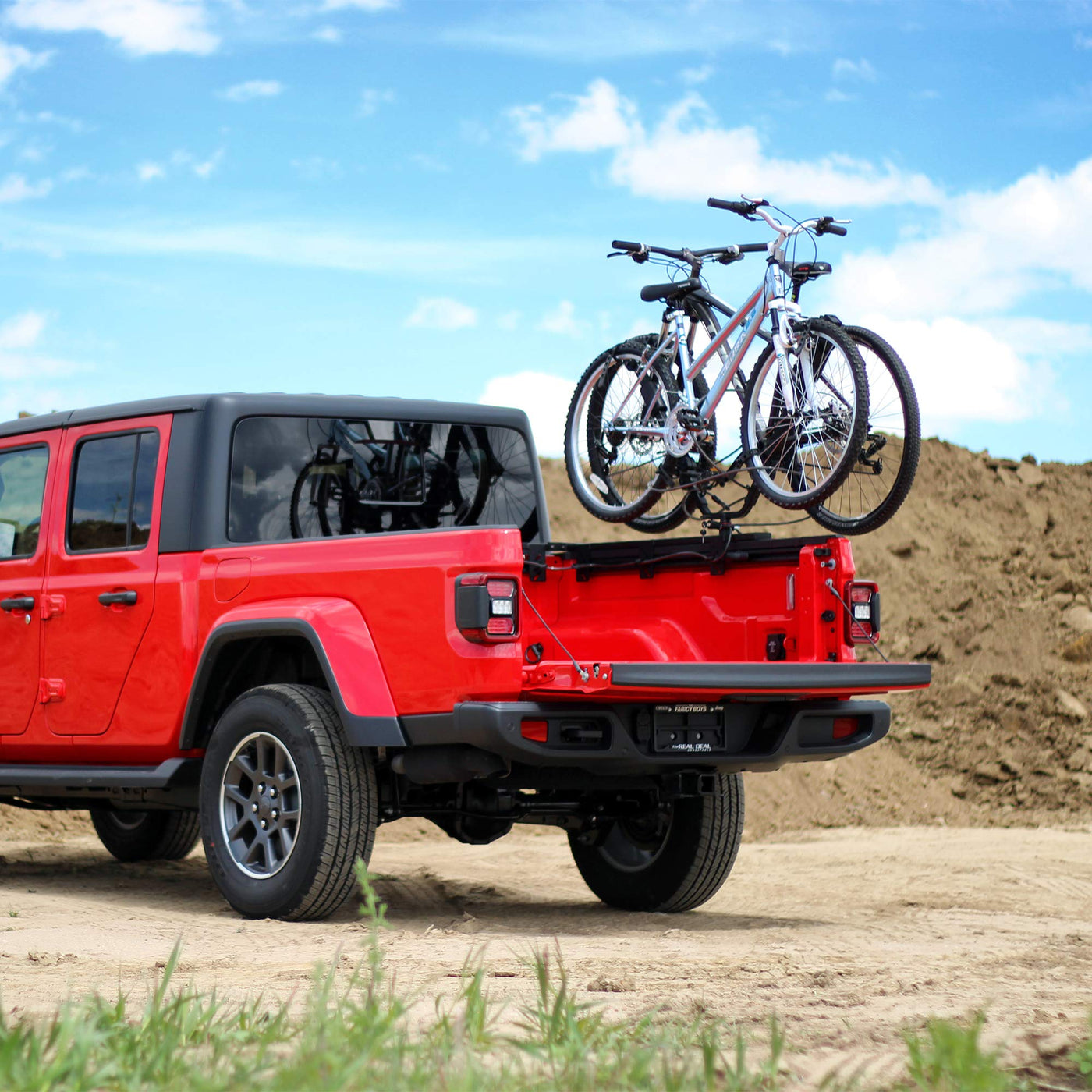 Two bike truck bed mount rack for c-channel based systems transports bicycles above the bed side without blocking the beds interior capacity using Lets Go Aeros V-Rack technology. Featuring a rotating V-Wing for convenient load and unloading access of bikes, and an anti-theft RingLocker that locks bicycles to the Nelson and separately the Nelson rack to the truck bed.