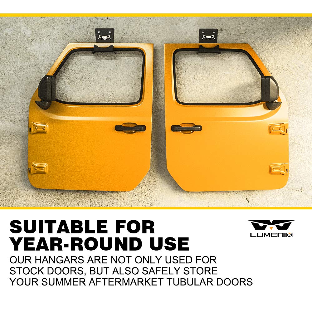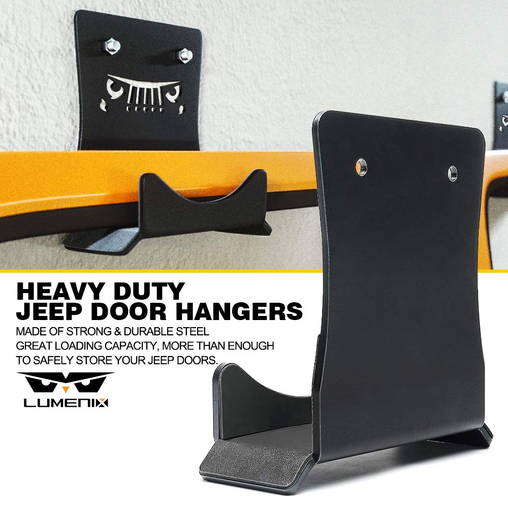 WIDE ADAPTABILITY- Jeep door hangers are suitable for doors of all Jeep models. It can hang and support 60lb jeep doors. It can be applied to household suspension, factory suspension, etc. | EXCELLENT MATERIAL CERTIFICATION - Stainless steel material, black powder coating protection, CNC exquisite cutting. Robust and durable integrated structure design, not easy to rust. | SECURITY PROTECTION JEEP DOORS - Lumenix door hangers added a rubber protection pad design to protect the side paint of the door frame from damage. | INSTALLATION METHOD - Need to pre-drill holes, equipped with square head bolts, screw in the screws to adjust the horizontal position. It can be installed on the wall or wall nail wooden strips. | PACKAGE DETAILS - 4x Jeep door hanger, including necessary parts for installation.