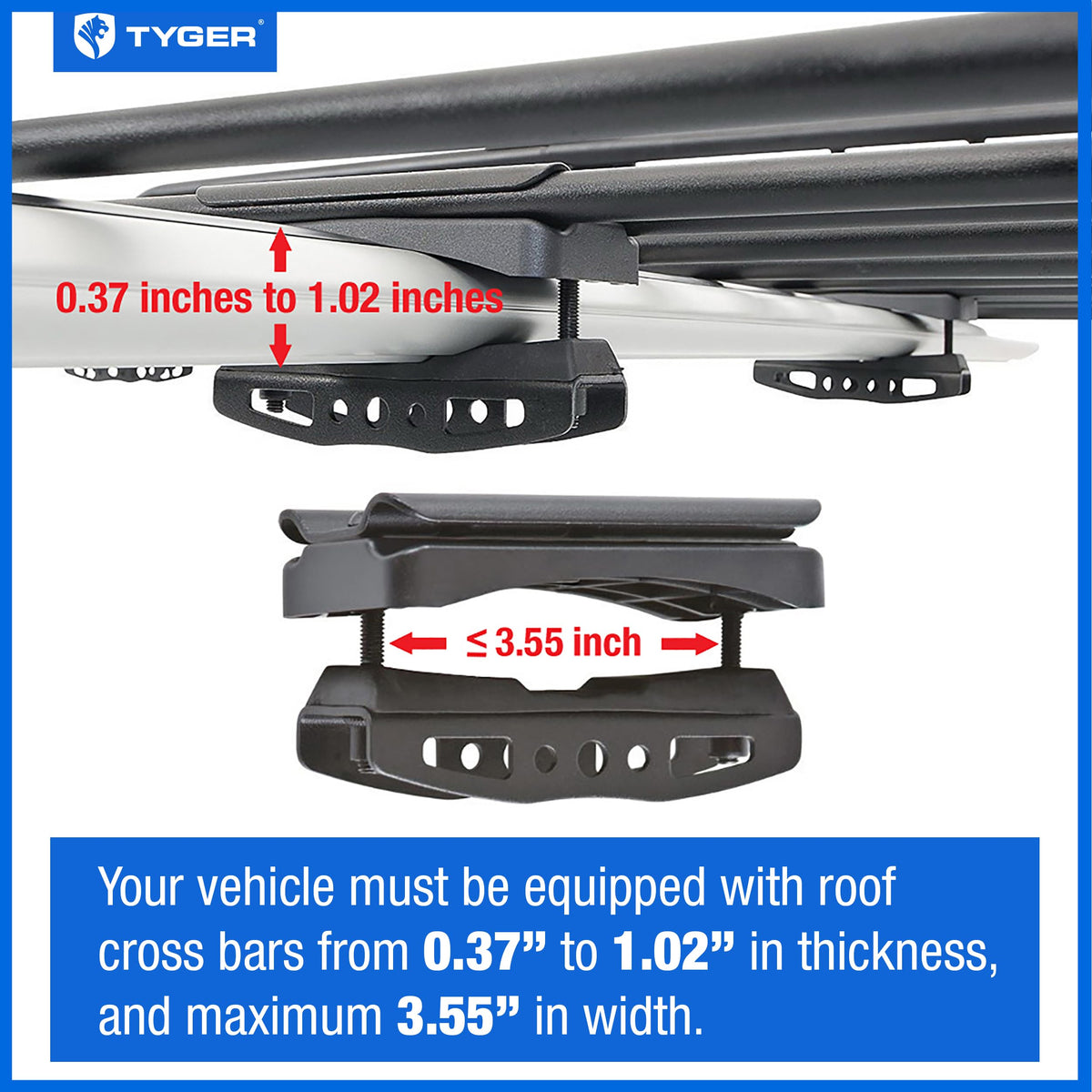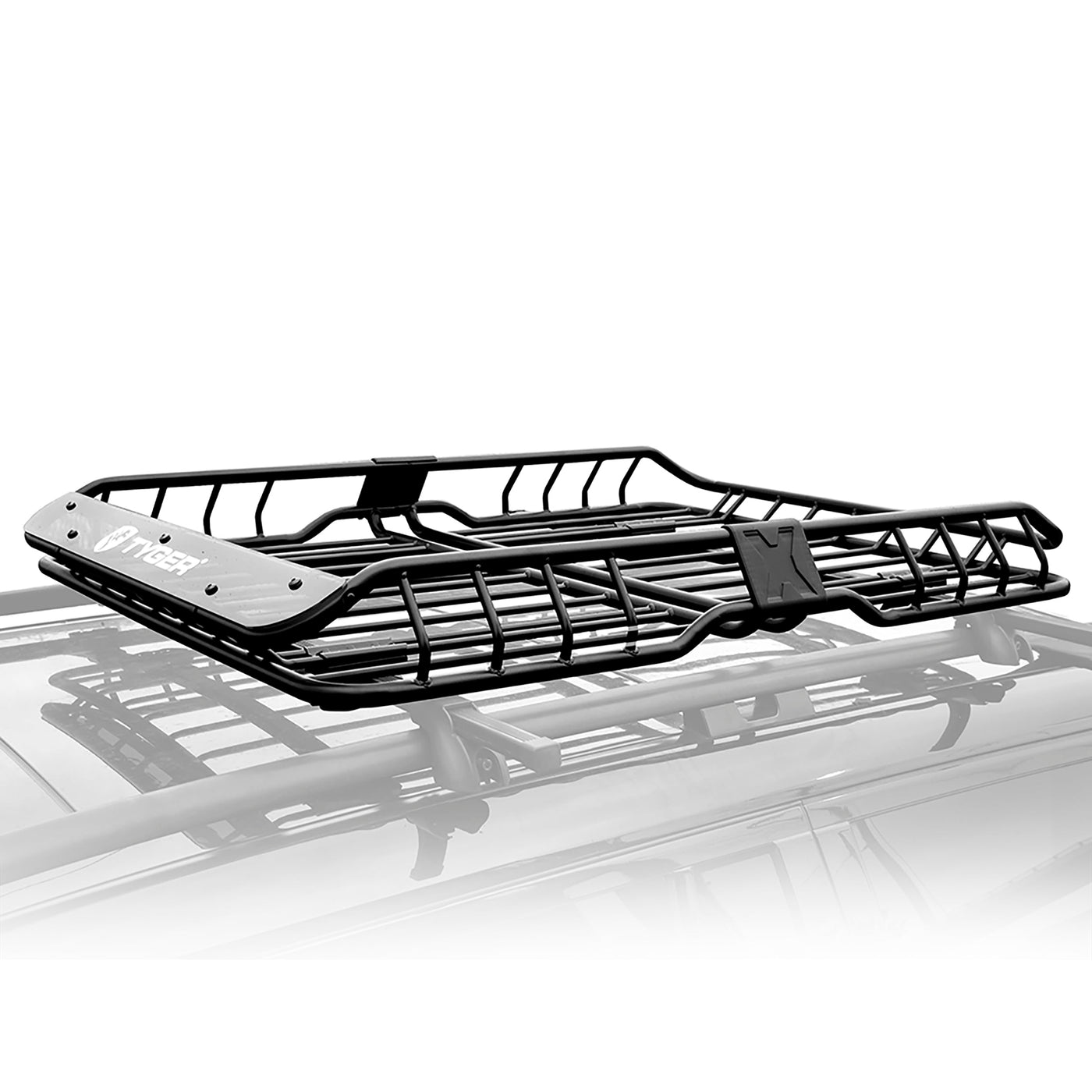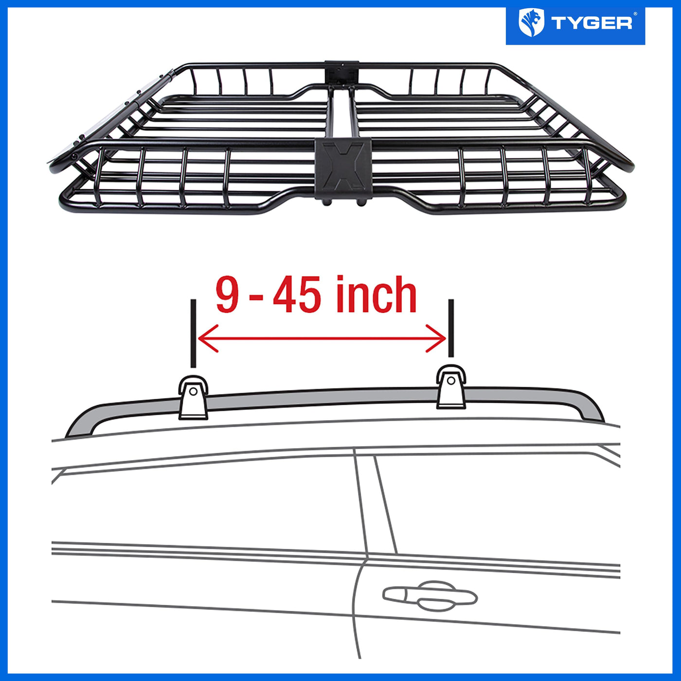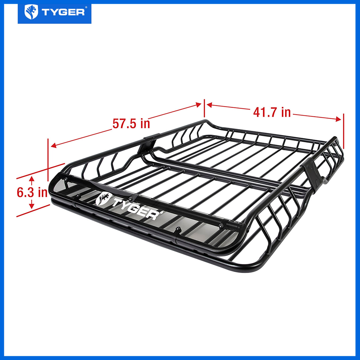 Frame Dimension: L57.5'' x W41.7'' x H6.3'' | Stylish design makes your vehicle stand out on the road! Mounts to any existing vehicle roof rail cross bars to provide extra storage capacity up to 150 lbs. | Heavy duty 1 inch steel frame tube with black E-Coating for rust resistance and provides many tie-down point locations, great for securing gear with cargo nets. | Easy two-piece assembly. All mounting hardware included.(Your vehicle must have roof rails and cross bars installed to mount this basket). | TYGER No-Hassle Quality Warranty for US customers!