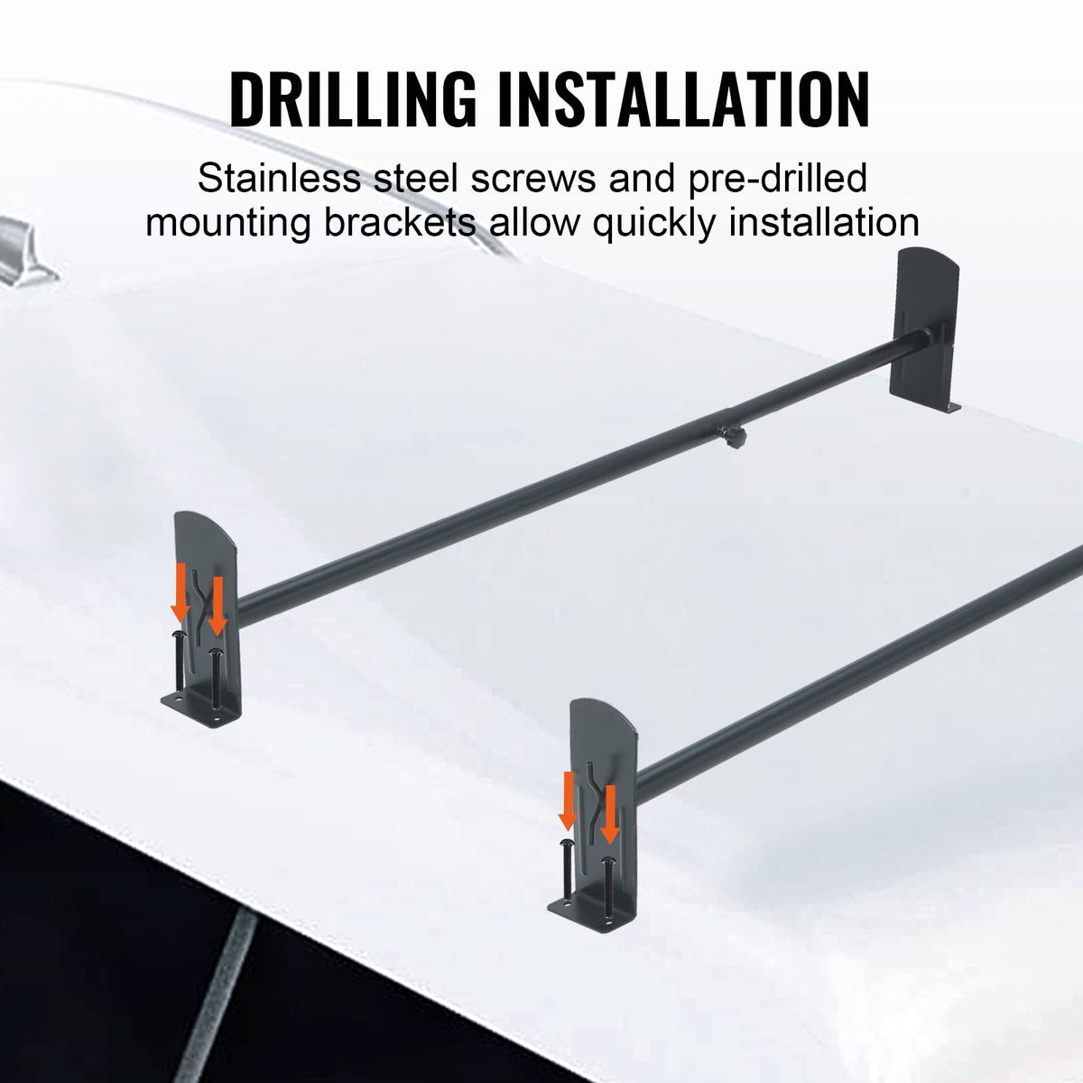 Q: Do I need to drill holes to install the VEVOR Van Ladder Racks?A: No drilling is required for installation. The ladder racks can be easily installed on the rain gutters of your van using basic tools, thanks to their clip type construction that allows for quick installation and removal.