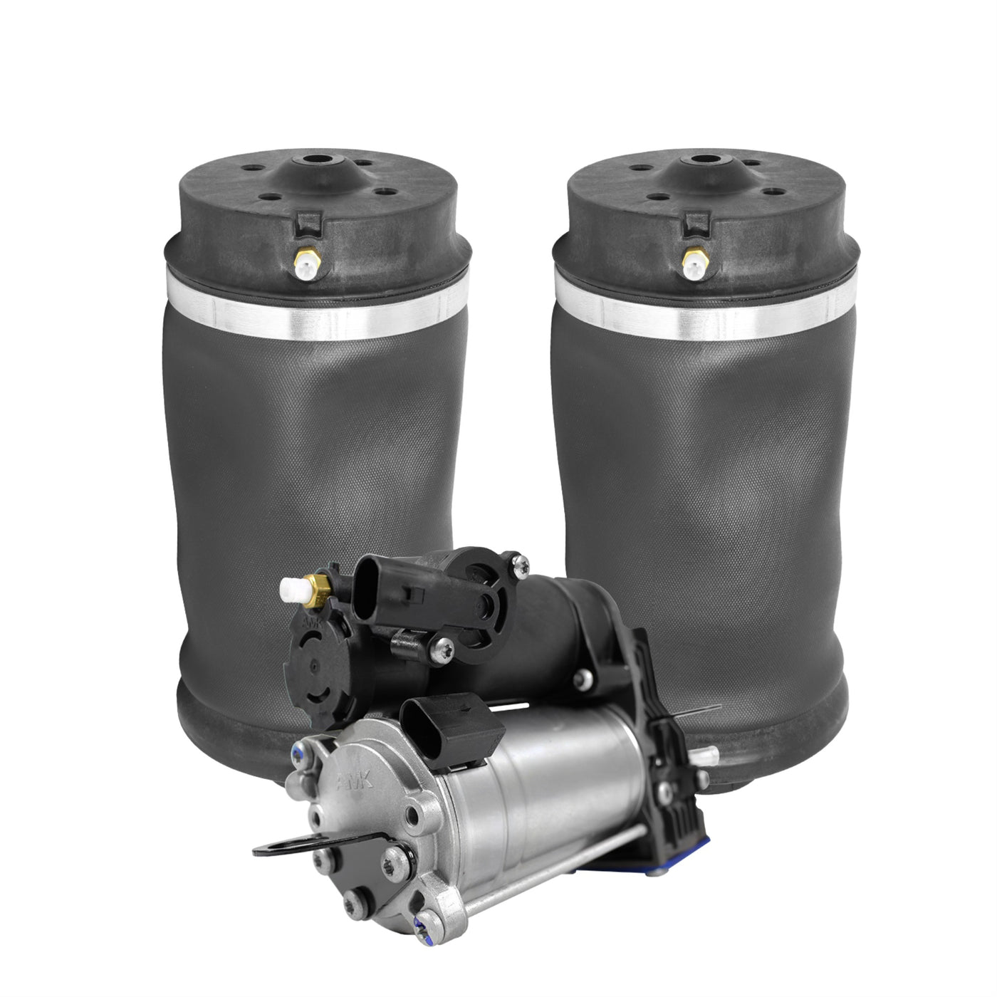 Q: What is included in the Unity Automotive air spring kit?A: The kit includes two rear air springs and an air suspension compressor pump. This complete set is designed to restore your vehicle's factory ride height.