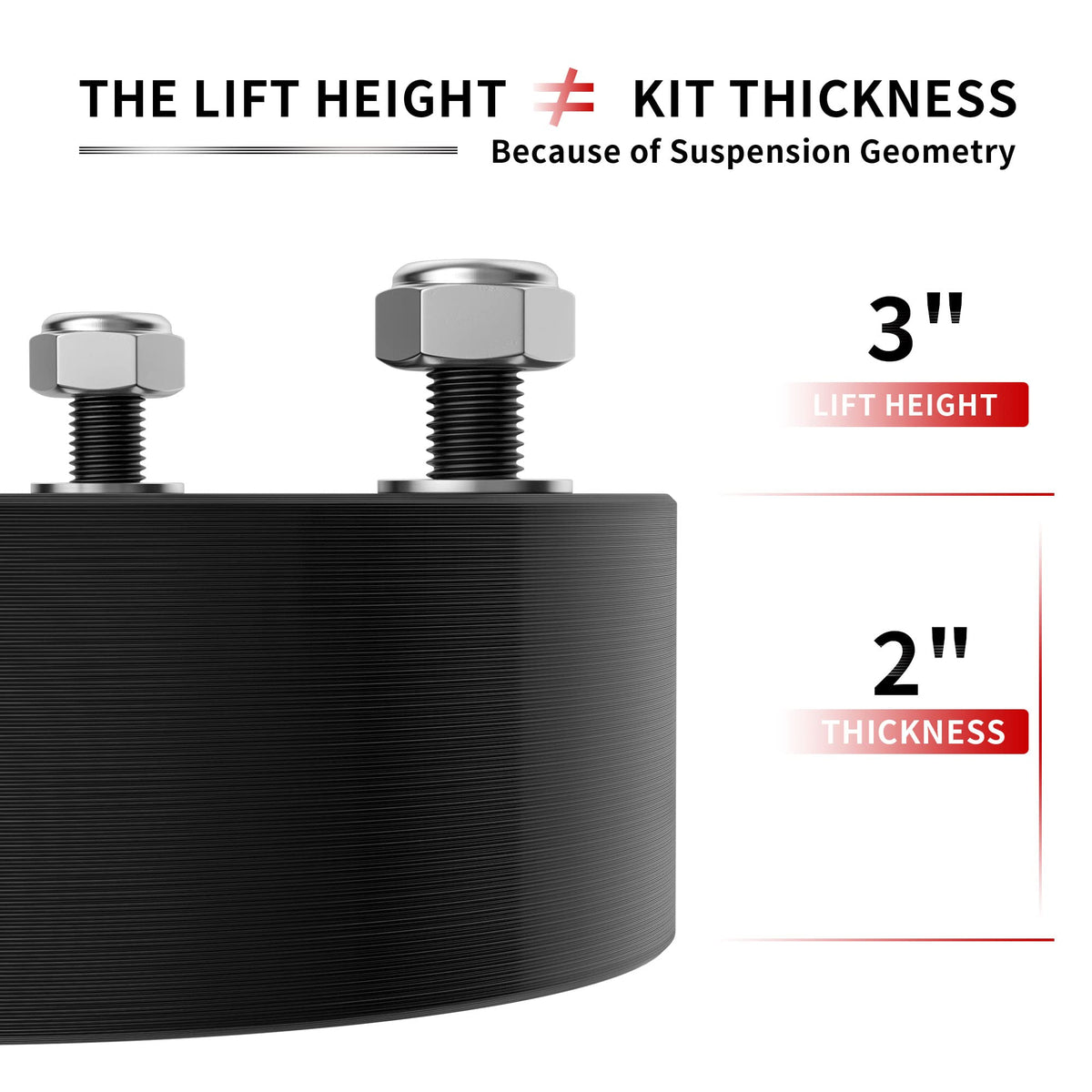 Important Note: Lift the front by 3. Due to suspension geometry, the ratio of the lifting height to the thickness of the lift kit is not 1:1.