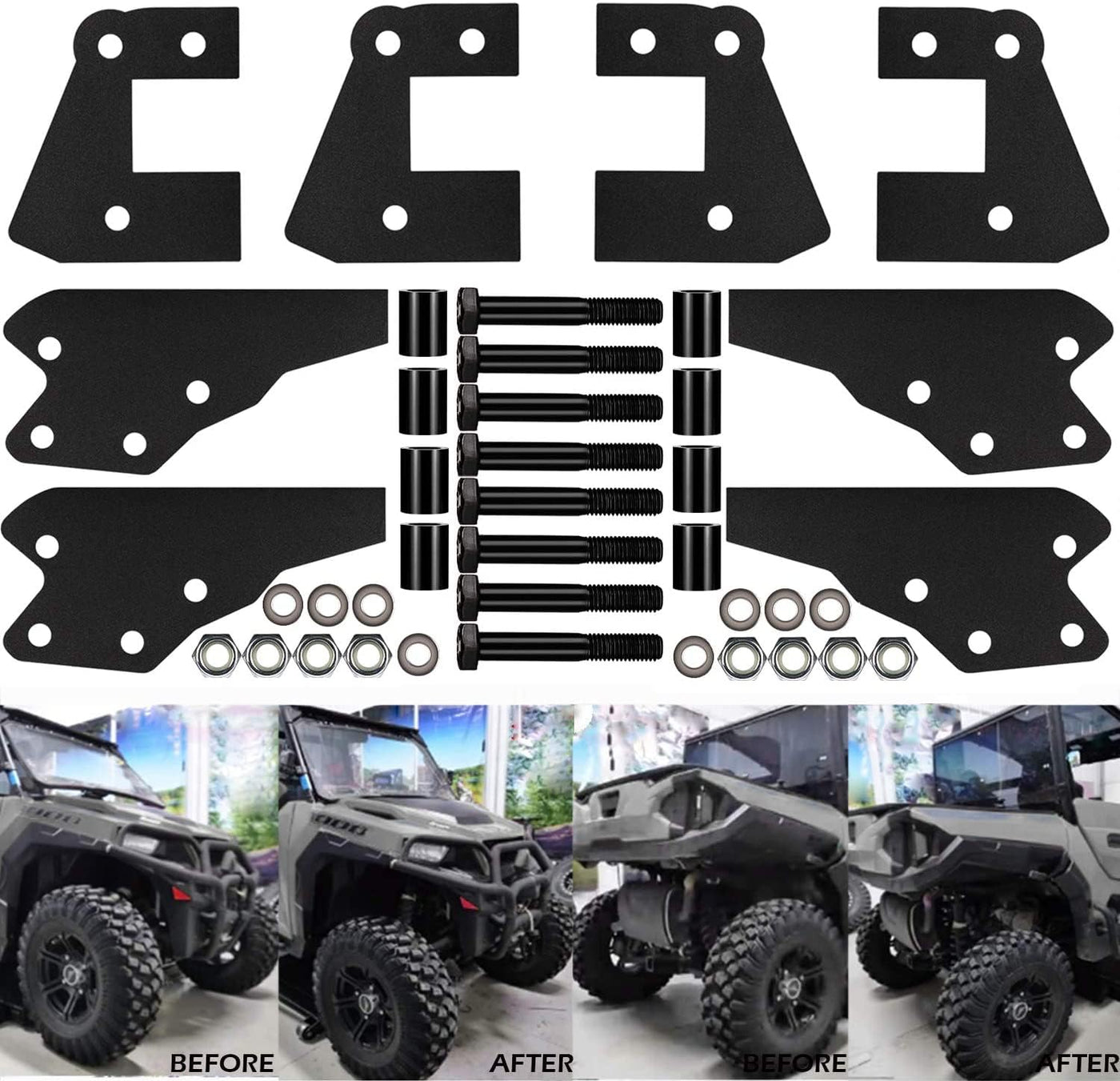 Q: What materials are used in the construction of this lift kit?A: The lift kit is constructed from high-carbon steel, providing durability and resistance to impact. It is CNC-laser cut for precision and comes with a black powder coat finish to prevent oxidation and rust, ensuring long-lasting performance.