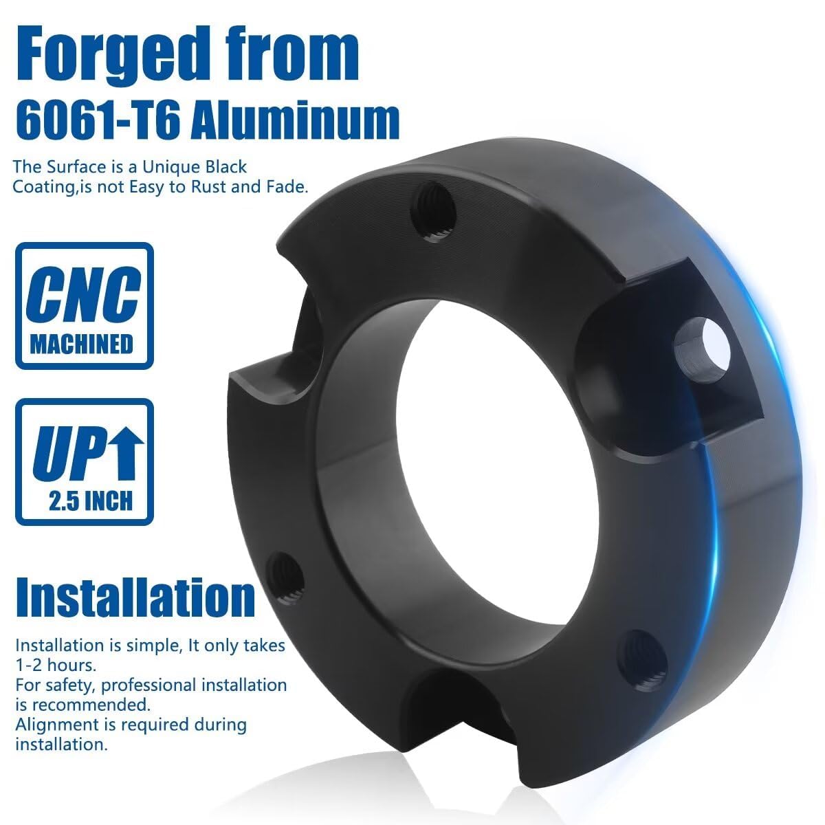 Package Included package: 2 x 2.5inch Black Front Leveling Lift Kit Strut Spacers Benefits Perfectly levels the front with the rear of the vehicle, expand the gap between the wheel and the fender, and gain additional ground clearance, making the vehicle look more aggressive. You can install larger and wider tires/rims Material Forged from 6061 T6 aluminum, with 12.9 studs, more sturdy and reliable.The surface is a unique black coating, is not easy to rust and fade Note Due to the geometry of the suspension, the lift height and kit thickness are not 1:1, they will raise the front truck by 2.5'', but the front kit thickness is less than 2.5'' Installation Bolt fixing, easy to install, no vehicle modification required.It takes about 1-2 hours, without the need to remove the strut/coil like other kits.Save your time and money ! Not difficult, but professional installation is recommended. It is recommended to align after installation.Need to align the installation