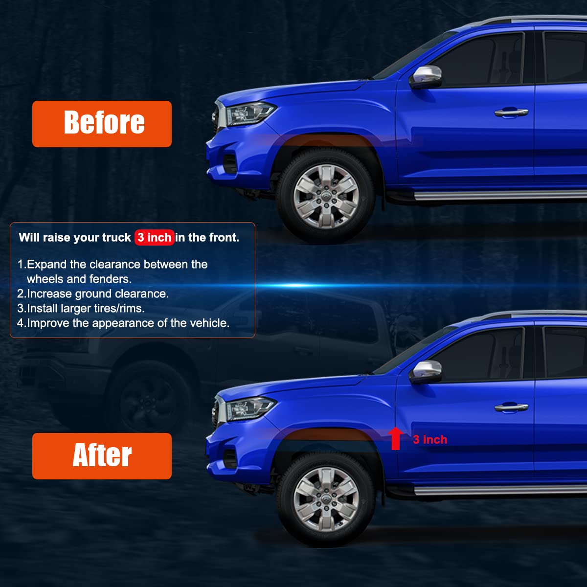 Trucks equipped with the Active-Level Four-Corner Air Suspension. IMPORTANT NOTES The Forged leveling lift kit will lift the front of the truck 3 inch Due to the geometry of the suspension, The leveling kit is not 3 inch thick. The ratio of vehicle lift height to lift kit thickness is not 1:1 The lift kit does not include the thickness of the original factory lift kit. Before you install a new strut spacer, you will need to remove the original factory lift kit or it will not work properly FEATURES - Manufactured from 6061-T6 aluminum billet, more sturdy and lightweight - Completed by CNC machining, the size is more accurate - The pre-installed 12.9 grade bolts have higher strength and toughness than the 10.9 grade bolts. Not easy to break with time - The surface is coated with a unique black coating, which has stronger anti-rust performance BENEFITS - Expand the gap between the wheel and the fender - Increase additional ground clearance - Make the vehicle look more aggressive - Improved appearance and performance - Install bigger, wider tires/rims - No need to replace factory parts, maintain factory quality SIMPLE INSTALLATION Our leveling kits require no professional tools and can be quickly installed with basic tools. Can be completed in 1-2 hours