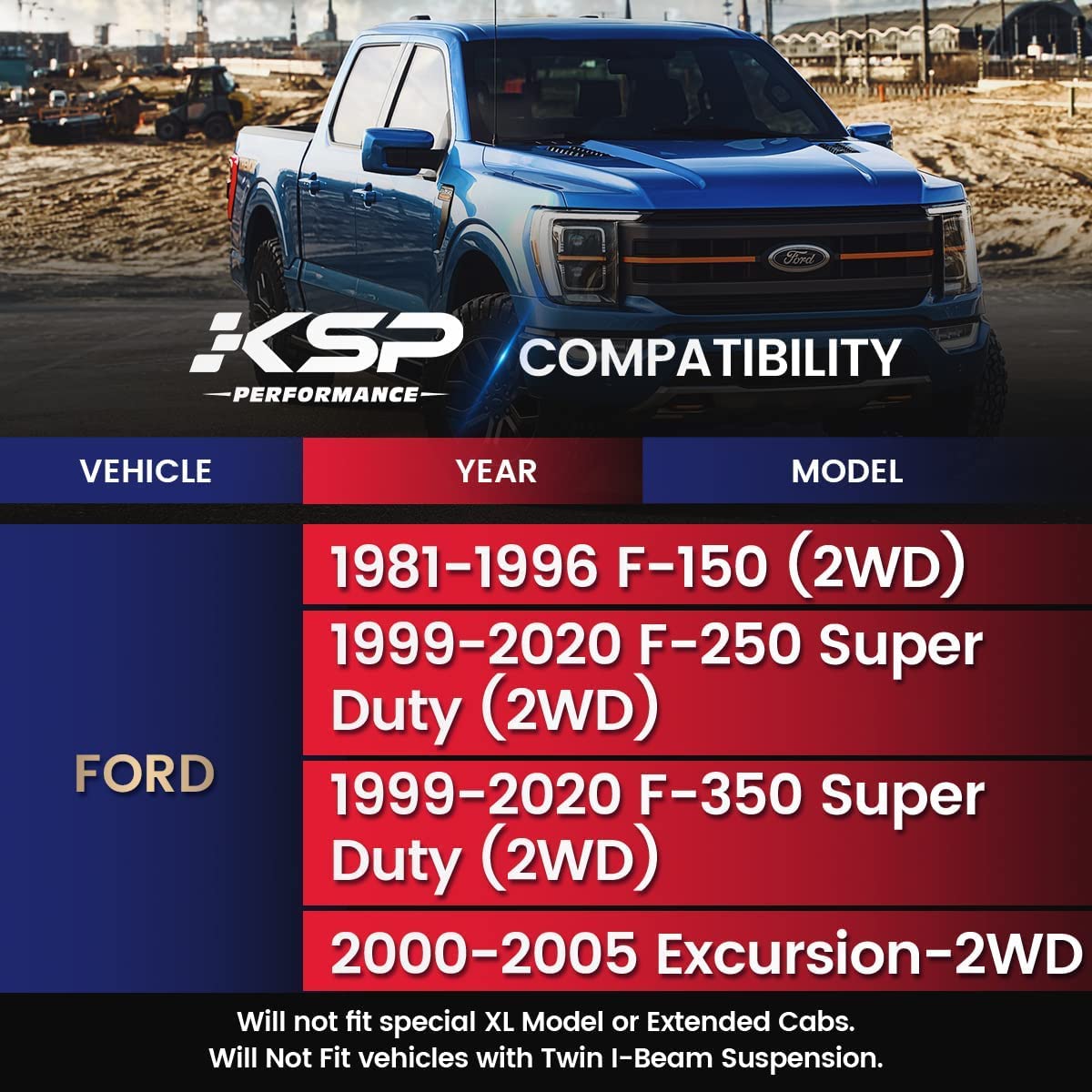 Please NOTE: Lift amount does NOT equal spacer thickness owing to the suspension geometry. Please message us for more information. Fitment:1999-2020 F-250 Super Duty (2WD)1999-2022 F-350 Super Duty (2WD)2000-2005 Excursion (2WD)**Will not fit special XL Model or Extended Cabs.**Will Not Fit vehicles with Twin I-Beam Suspension. KSP performance premium front lift spacer will raise the front of your FORD truck by a true 2''. It is CNC machined by aircraft billet aluminum with T6 treated covered lifetime warranty. We use 10.9 or 12.9 grade bolts with lock washer not like others 8.8 grade. This kit can increase ground clearance and levels the front and rear of the vehicle but factory ride quality maintained. Larger rims and tires can be allowed after install this kit. Its easy to install takes 1 to 2 hours just using basic tools and have no need to disassemble the strut. PDF files Installation Instructions can be request if you need. An alignment is recommended after the installation of this item. If have any question, please feel free to contact us by Amazon messages. We will try our best to supplying 100% Customer Satisfaction Guarantee.