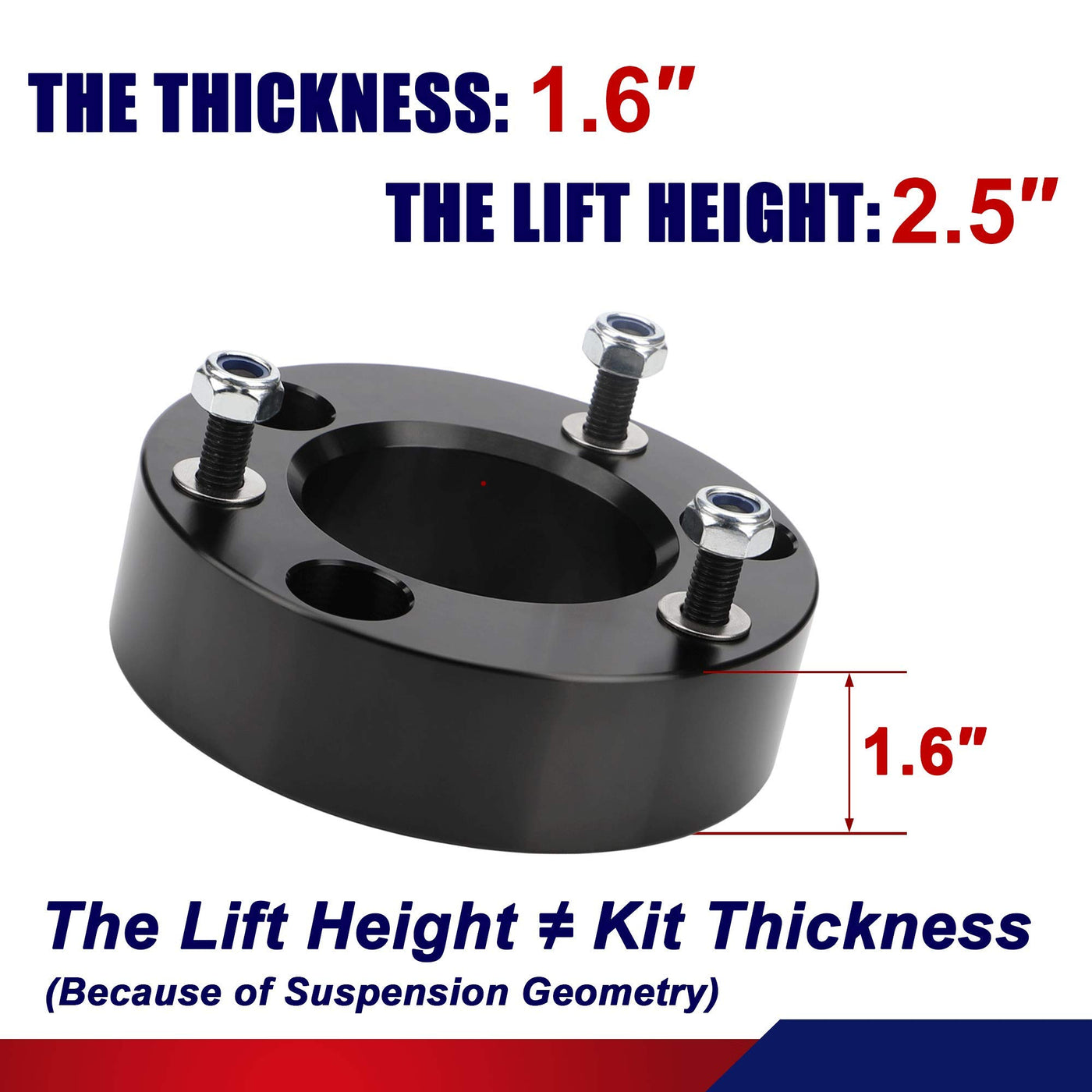 Q: What is the lift height provided by the Leveling Kit for F150?A: The Leveling Kit is designed to provide a true lift height of 2.5 inches for your F150, although the kit thickness is less than 2.5 inches due to suspension geometry.