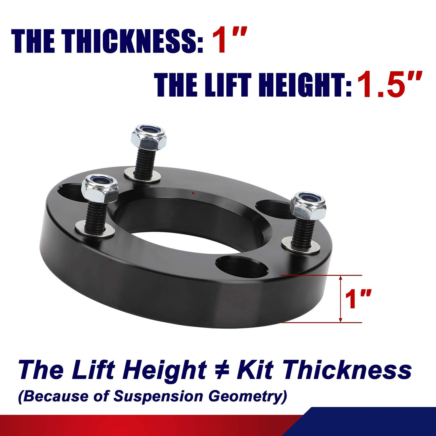 Q: What is the lift height of the Leveling Kits for F150?A: The Leveling Kits provide a true lift height of 1.5 inches for your F150, despite the kit thickness being less than 1.5 inches due to suspension geometry.