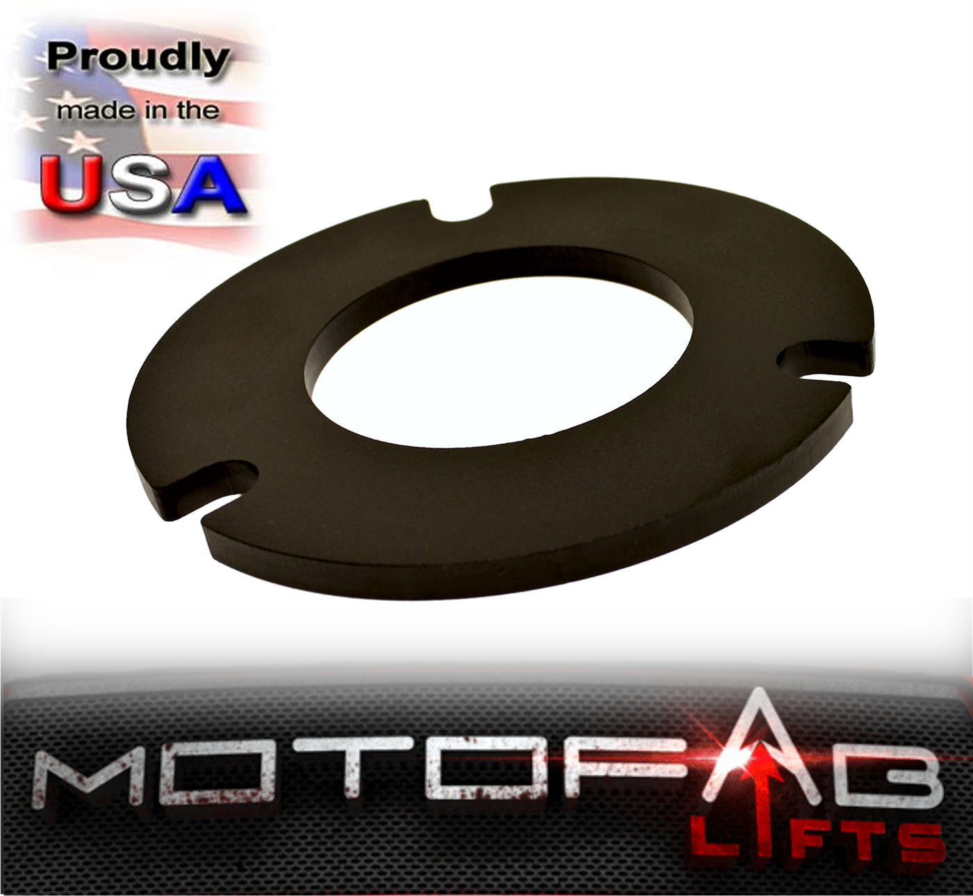 Q: What materials are used in the construction of this leveling kit?A: The MotoFab Lifts leveling spacers are CNC machined out of high-grade aluminum and are powder-coated black to match your factory suspension, ensuring durability and a strong aesthetic appeal.