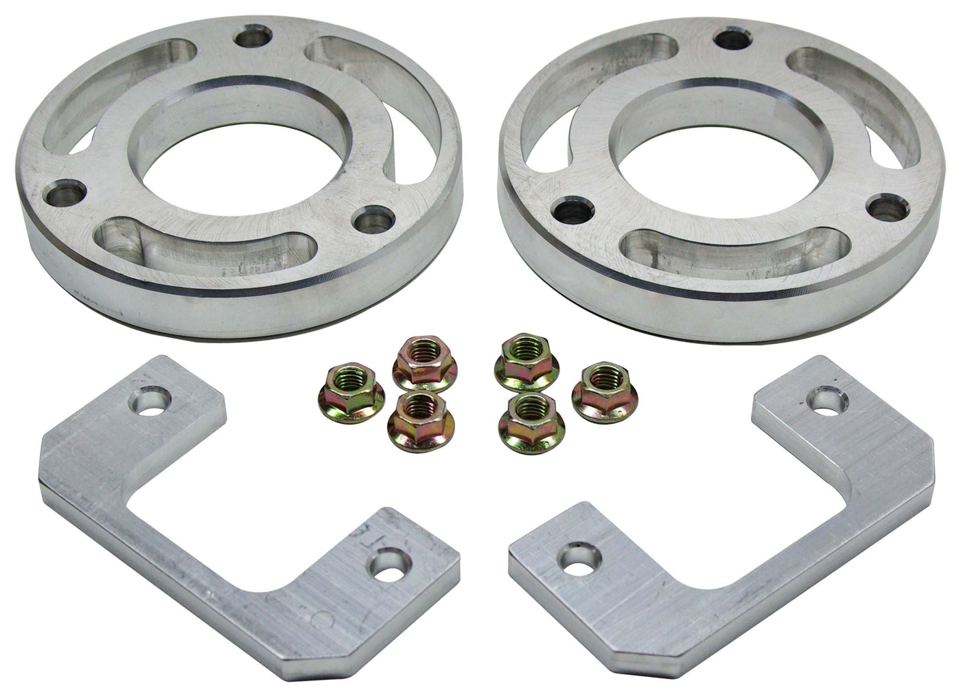 ReadyLift New Leveling Kit is the most cost-effective and time-efficient way to lift your pickup ride height by lifting the front 2.25 inches. ReadyLift suspension products do not require any permanent modification to factory parts and never compresses the factory springs or require cutting the strut studs. ReadyLift leveling kit systems will not affect your factory OEM ride quality or comfort level. This kit includes two aluminum strut extensions and two aluminum lower strut mount spacers along with all necessary hardware.