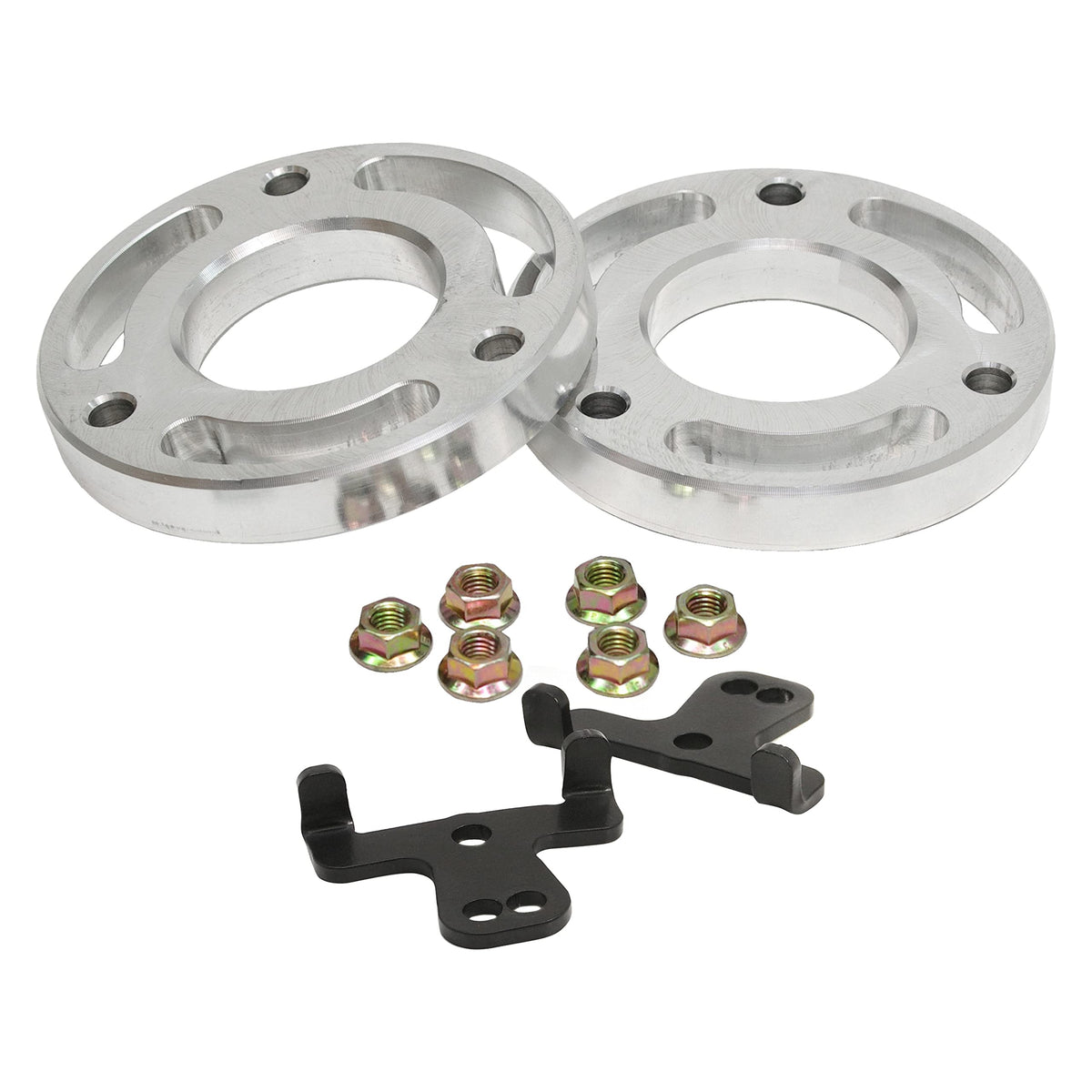 Q: What materials are used in the construction of the leveling kit?A: The ReadyLIFT leveling kit spacers are constructed from CNC-machined 6061-T6 aircraft-grade aluminum, which ensures durability and strength while maintaining a lightweight profile.