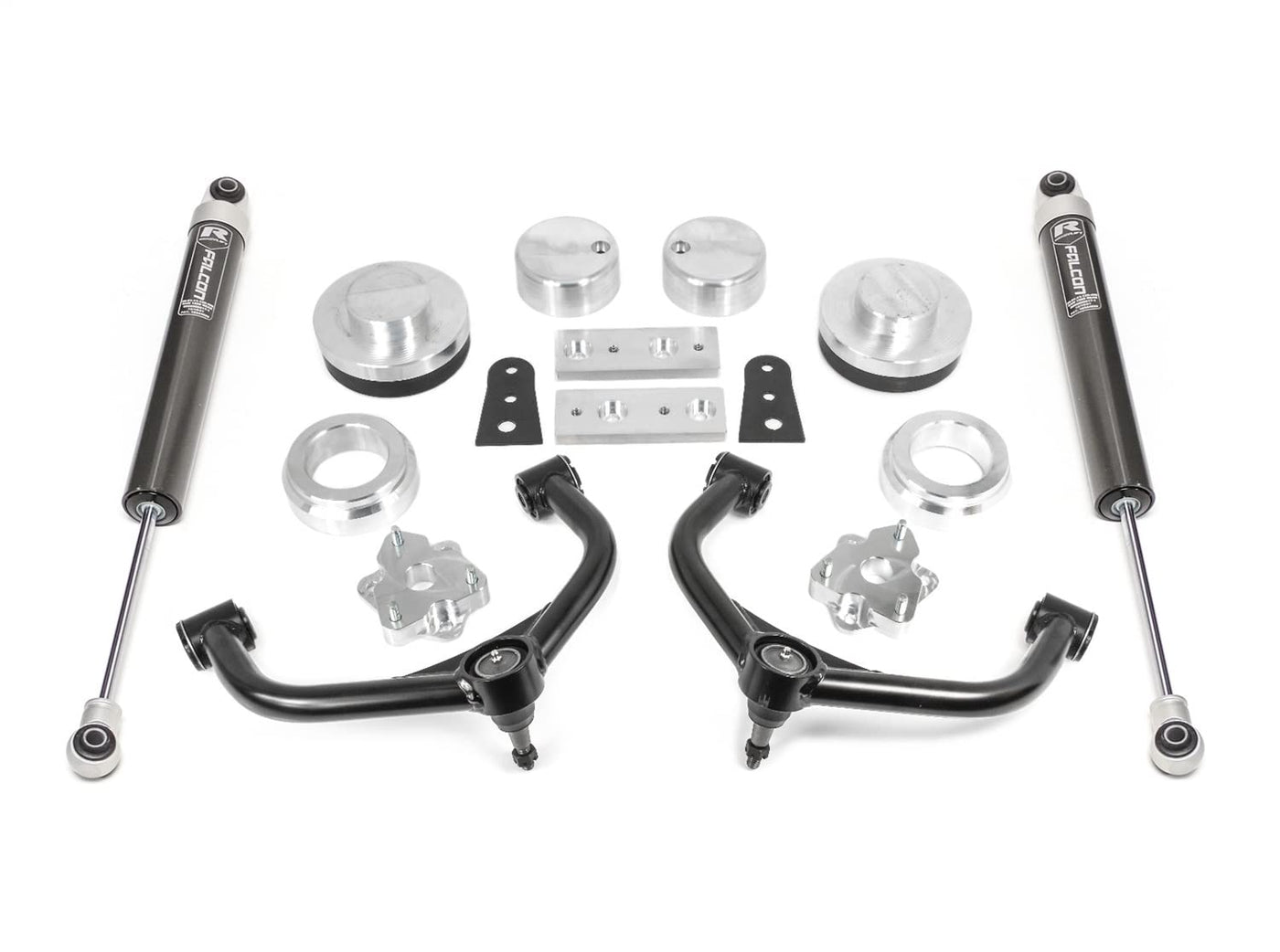 Q: What type of shocks are included in this lift kit?A: The lift kit includes Falcon 1.1 Monotube series rear shocks, which are designed for 0-2 inches of rear lift and provide enhanced ride quality and performance.
