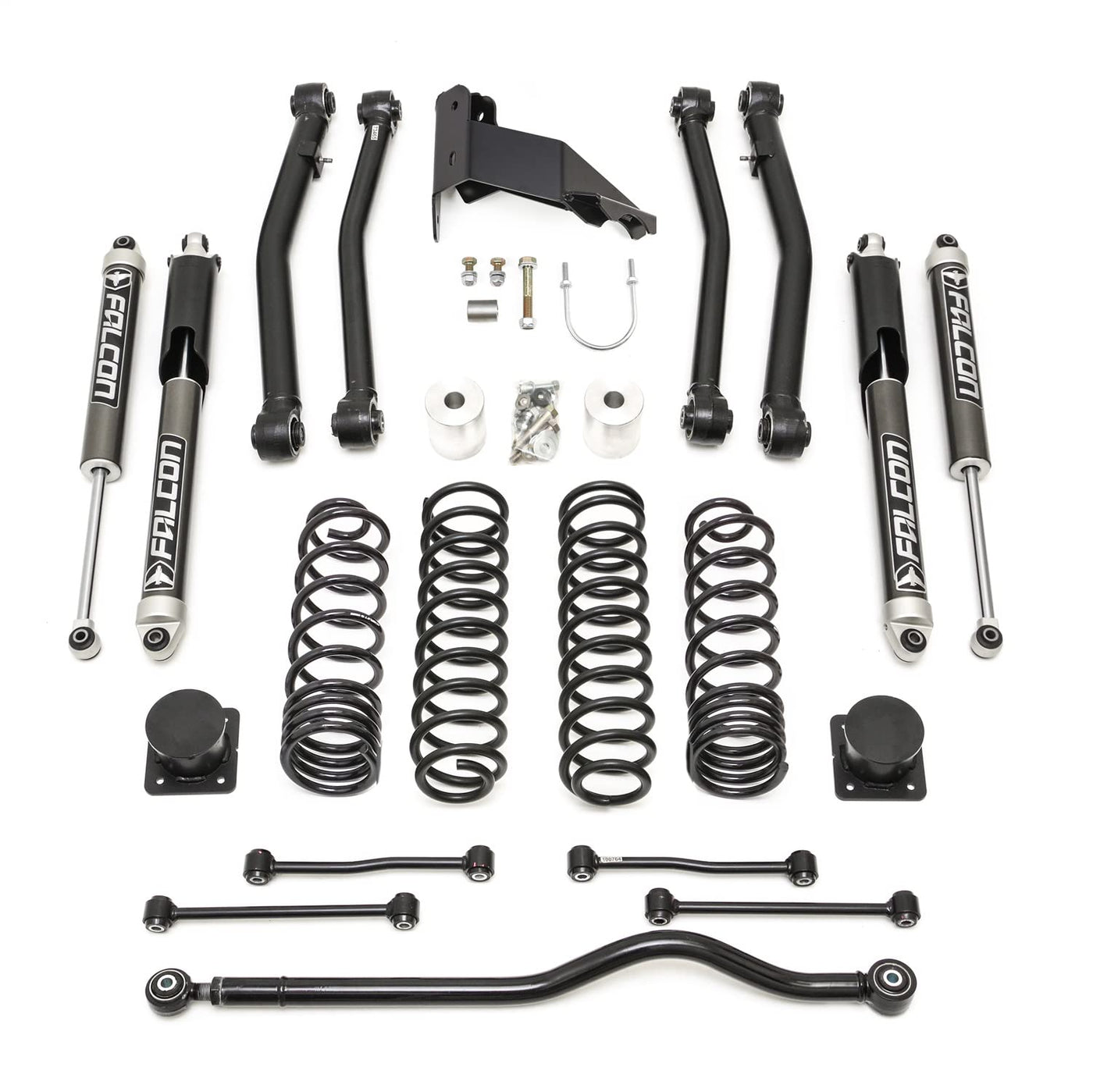 Q: What are the key features of the Falcon 2.1 shocks included in this lift kit?A: The Falcon 2.1 mono tube performance shocks are specifically designed for the JT Gladiator, enhancing both on-road comfort and off-road performance, ensuring a smooth ride across various terrains.