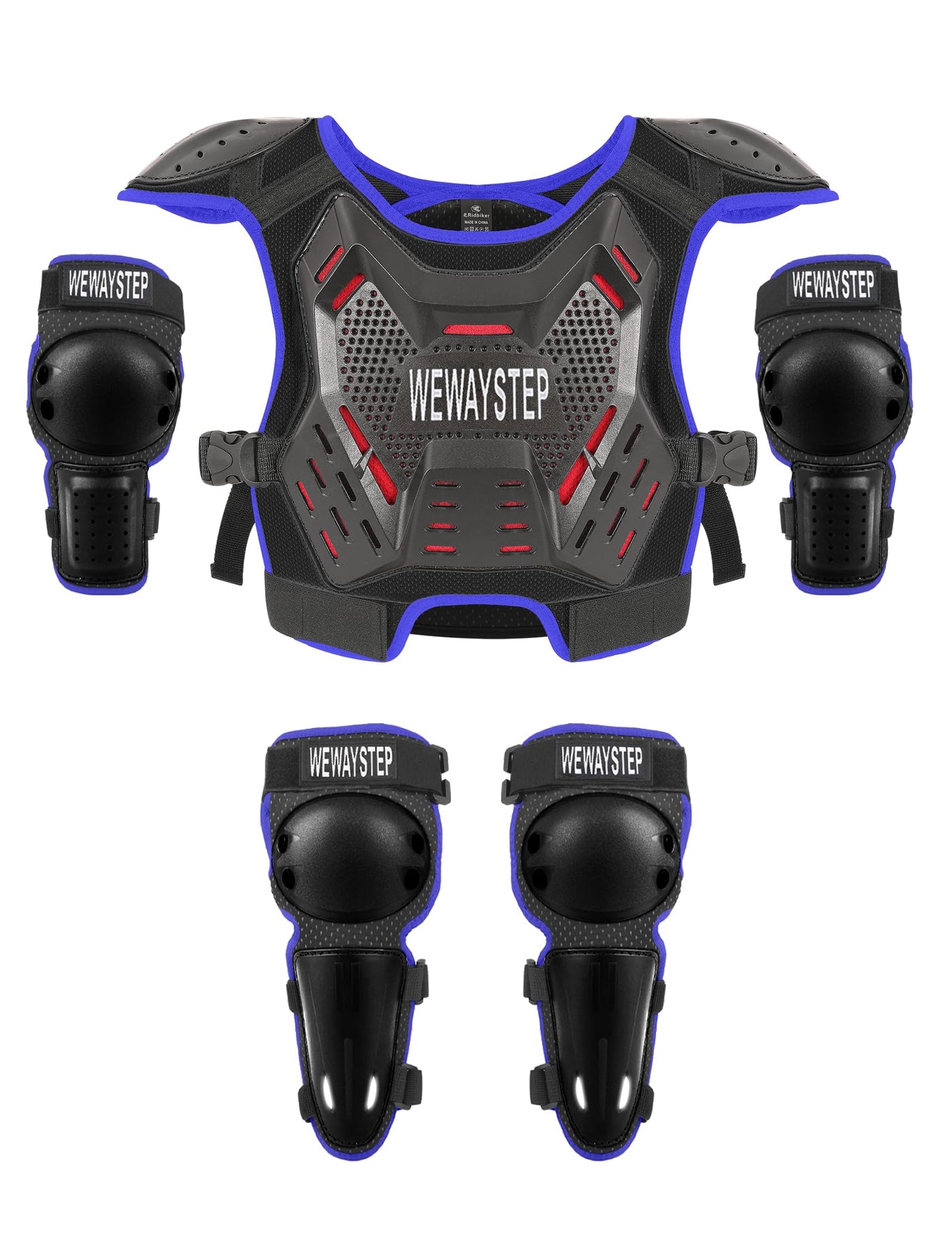 Kids Motorcycle Gear: Material: PP tough shell + Thickened 7 mm foam mesh fabric. Wide hook&loop waistband provides extra support at the waist. The bendable back protector design, riding on the way more flexible. The chest protector motocross set is designed with multiple hook&loop and buckles, making it easy to remove or wear. The outside of the knee and elbow pads are designed with a curved PP plastic shell, which greatly reduces the risk of injury. Package:1 X Chest Protector + 2 X Knee Shin Guard + 2 x Elbow Pads Color Options: Black, Blue, Red, Pink, Green Size: One Size, Suitable For 3-10 Years Children Wide Application:Kids Dirt Bike Gear Armor Suit for Motocross Cycling Skiing Skateboarding Roller Skating