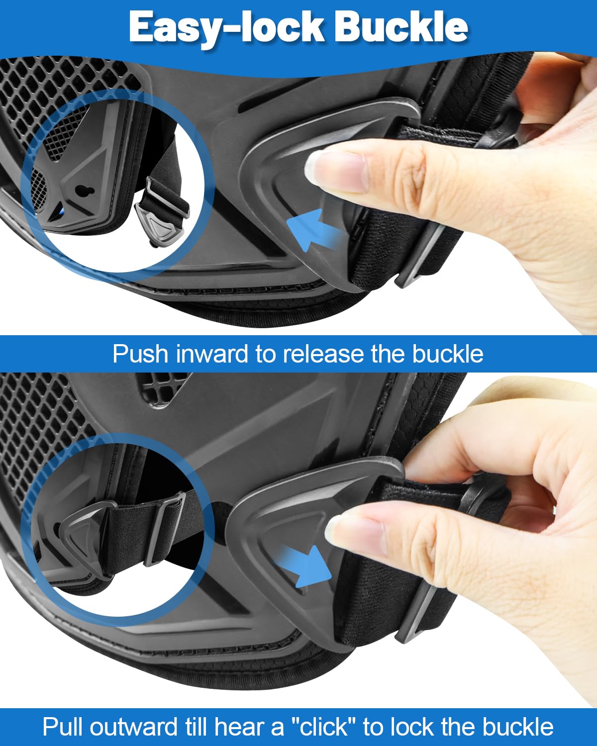 Q: How does the upgraded easy-lock buckle work?A: The upgraded easy-lock buckle features two slide-buckles with adjustable straps, making it easier for children to buckle and adjust the fit themselves, ensuring a secure and comfortable wearing experience.
