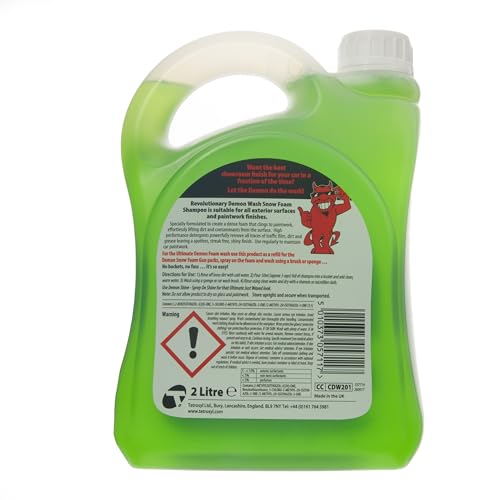 Manufacturer the best showroom finish for your car in a fraction of the timeless The Demon do the work. The revolutionary Demon foam is suitable for all exterior surfaces and paint work finishes. Specially formulated to create a dense foam that clings to paint work, effortlessly Lifting dirt and contaminants from the surface. High performance detergents powerfully remove all traces of traffic film, dirt and grease leaving a spotless, streak free, shiny finish. Use regularly to maintain car paint work. rinse off loose dirt With cold water. Pour 50ML (approx. 3 caps) full of shampoo into a bucket and add clean, warm water. Wash using a sponge or car wash brush. Rinse using clean water and dry with a chamois or microfibre cloth.