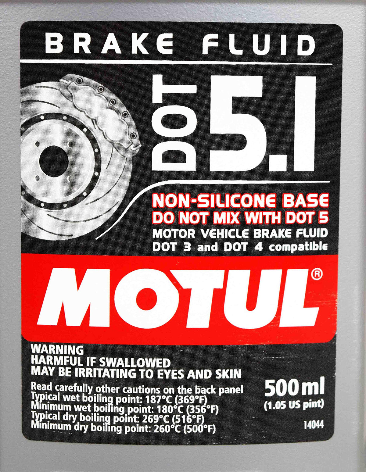 TYPE OF USE All types of hydraulic actuated brake and clutch systems in accordance with DOT 5.1, DOT 4 and DOT 3 manufacturers recommendations. Fluidity specially designed for anti-locking brake systems (ABS). PERFORMANCE STANDARDS : FMVSS 116 DOT 5.1 NON SILICONE BASE, DOT 4 and DOT 3 SAE J 1703 ISO 4925 (5.1, 4 & 3) Long life fluid: The high wet boiling point (187C / 369F), superior to DOT 4 (155C / 311F mini) and DOT 3 (140C / 284F mini) conventional fluids enables to use this product longer. Indeed, DOT 3 / DOT 4 and DOT 5.1 brake fluids have the property to absorb humidity contained in the air, which reduces their boiling points and consequently security. The wet boiling point is representative of the fluid after one year of use. Specially designed for anti-locking brake systems (ABS): The viscosity (820 centipoises at -40C / -40F) lower than DOT 4 (up to 1800 cp) and DOT 3 (up to 1500 cp) brake fluids allows an easier fluid circulation in micro-valves of anti-locking systems. Perfectly neutral with seals used in braking systems. Anti-corrosion. RECOMMENDATIONS Mixable with DOT 3, DOT 4 and DOT 5.1 NON SILICONE BASE products. Do not mix with silicone (DOT 5 silicone base) or mineral base fluids (LHM). Store brake fluid in its original container, tightly closed to avoid absorption of moisture. Aggressive chemical product if contact with hands, paint or varnish. If skin contact, rinse thoroughly with water. Drain Interval: 12 to 24 month as per manufacturers recommendations. PROPERTIES 100% synthetic fluid, polyglycol bases. Color Yellow Dry boiling point 269 C / 516 F Wet boiling point 187 C / 369 F Viscosity at -40C (-40F) 820 mm/s Viscosity at 100C (212F) 2.1 mm/s Warning: This product can expose you to chemicals which is [are] known to the State of California to cause cancer and birth defects or other reproductive harm.