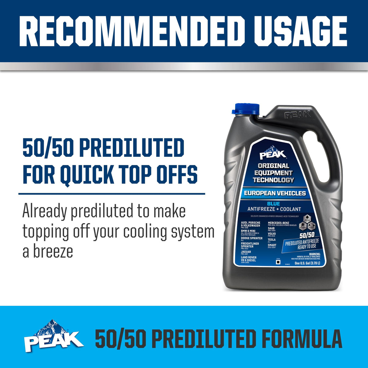 Peak Original Equipment Technology Extended Life Blue 50/50 Prediluted Antifreeze + Coolant For European Vehicles Is A Line Of Premium Coolants Specifically Designed To Match The Technology And Color Requirements Of European Vehicles And Is Formulated With The Same Corrosion Inhibitor Technology That Protected Your Vehicle Straight From The Factory. Peak Oet European Blue Extended Life 50/50 Prediluted Antifreeze + Coolant Formula Is Based On Proprietary Silicate-Enhanced Hybrid Organic Acid Technology (Si-Hoat), And Is Specifically Designed To Provide Protection Of Your Vehicles Engine Cooling System Metals Against Damaging Rust And Corrosion. It Is Compatible With Other Blue Si-Hoat Formulations And Is Perfect For Topping Off Your Cooling System. This 1 Gallon Bottle Is Recommended For Use With European Cars And Trucks Requiring An Blue Si-Hoat Formula, Including: Pre-1996 Audi, Porsche And Volkswagen Vehicles, All Bmw And Mini, Including Hybrid And Electric Models, All Dodge Sprinter, Pre-2013 Freightliner Sprinter, Pre-1997 Jaguar, 1990-2005 Land Rover V8 And Diesel, Pre-2014 Mercedes-Benz, Including Hybrids, Pre-2000 Saab, Pre-2015 Volvo, All Tesla, 2011-2014 Smart, And Other European Vehicles Requiring A Blue Coolant Formulation. When Installed As Part Of A Complete Flush And Coolant Fill, Peak Guarantees This Coolant Will Provide Service Life Protection Of Up To 150,000 Miles Or 5 Years.