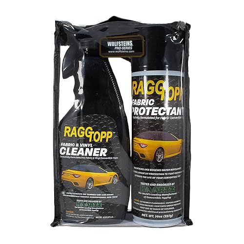 Q: Is RaggTopp easy to apply?A: Yes, RaggTopp products are user-friendly. Simply clean the surface with the Fabric/Vinyl Cleaner and follow up with the Protectant to maintain the integrity and appearance of your convertible top.