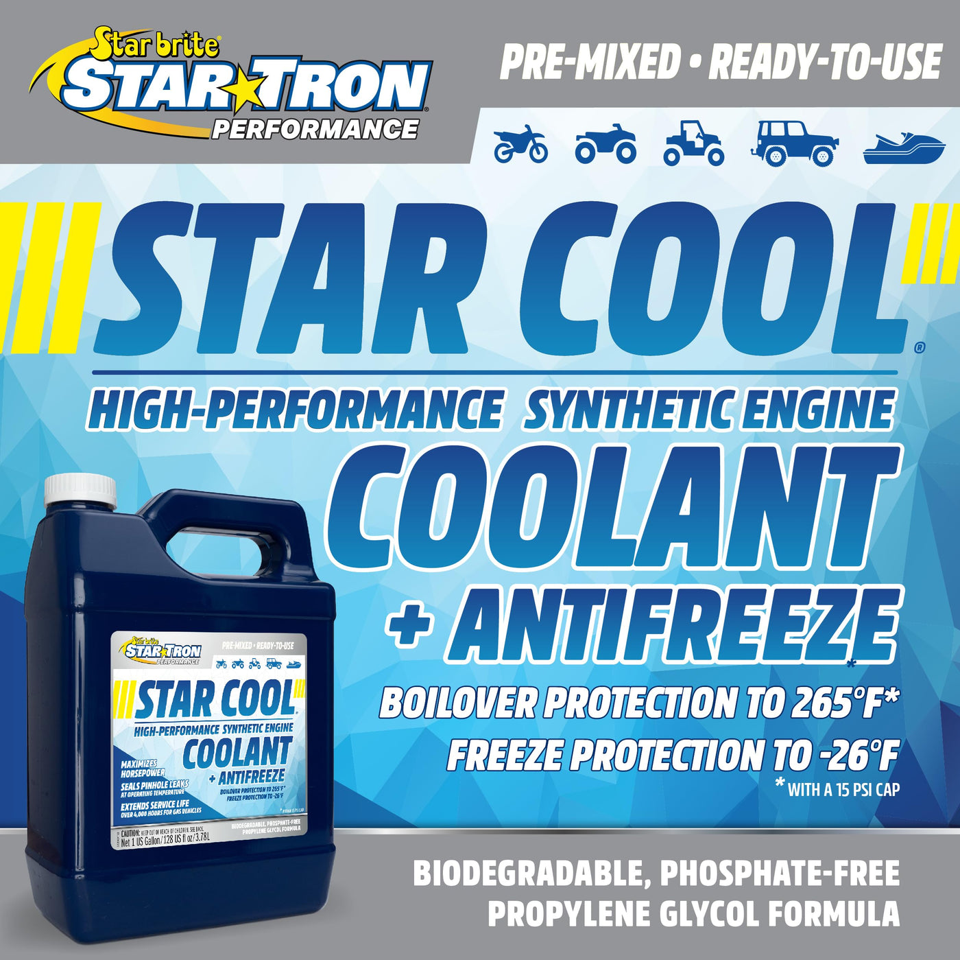 Unleash the full potential of your engine with STAR TRON Star Cool Premium Synthetic Engine Coolant + Antifreeze, the ultimate solution for maintaining peak performance and protection throughout the year. Crafted in partnership with the world's leading coolant additive formulators, Star Cool sets a new benchmark in coolant technology with its propylene glycol base and cutting-edge poly organic additives (POAT). This advanced formula not only ensures your engine operates at its optimum temperature for maximum horsepower but also offers an exceptional service life that far exceeds OEM specifications, making it perfect for both gasoline and diesel engines. Star Cool's innovative design offers unparalleled protection against corrosion, seals pinhole leaks and small cracks, and is pre-mixed with de-ionized water for immediate use. It's ideal for all water-cooled engines, providing year-round protection from boil overs up to 265F and freezing down to -26F..DIRECTIONS: Do not remove radiator cap if hot. Refer to Manufacturers Engine Service Manual for flushing and filling. DIRECTIONS 1. If none are available: 1. Check cooling system for leaks, loose connections or worn parts. 2. Remove radiator cap, open radiator and engine block drains, then flush system completely with clean water. 3. Close radiator and engine block drains when all water is drained out of system. 4. Fill system with STAR TRON Star Cool Synthetic Engine Coolant. DO NOT ADD WATER. Make sure that the level is slightly lower than the filler neck. 5. Run the engine for 5-10 minutes to reach normal temperature; the thermostat should now open, releasing any trapped air. If necessary, add more solution to fill radiator. 6. Finally, replace radiator cap and check for any leaks.