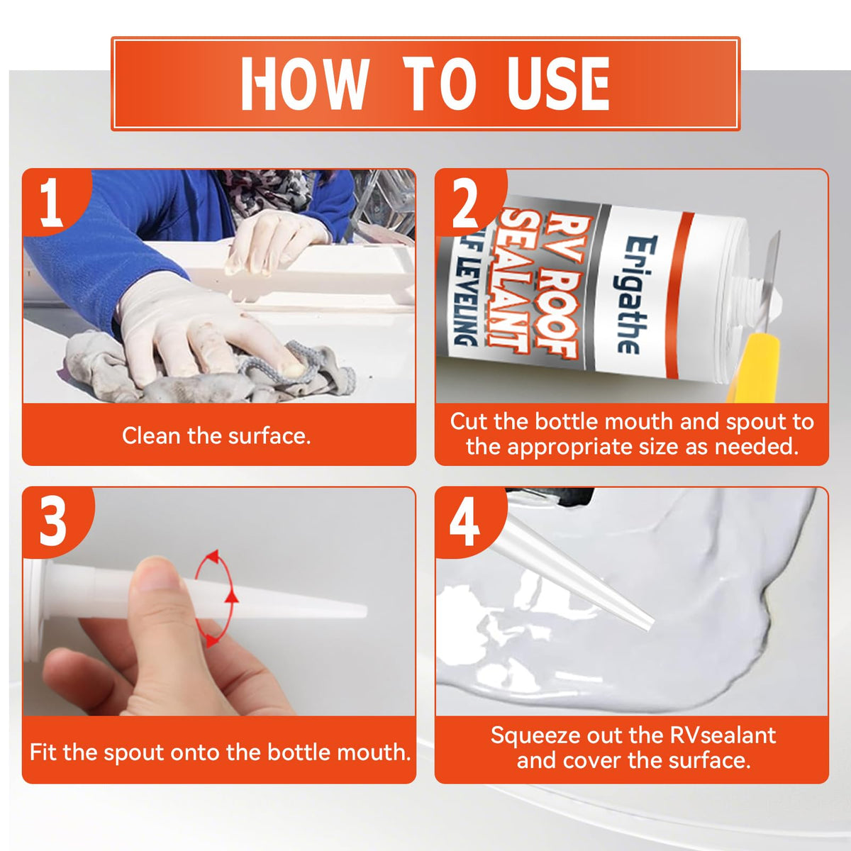 Erigathe: The Ultimate Protection for Your RV Roof! RV owners, say goodbye to leaks and hello to worry-free adventures! Erigathe Self-Leveling RV Roof Sealant is engineered to outlast the toughest conditions-UV rays, freezing winters, desert heat, and road stress-with a flexible, self-leveling formula that requires no expertise. Why Erigathe Stands Out: Self-Leveling Precision - Automatically fills gaps around vents, seams, and trim for a smooth, professional finish. 10X Stronger Adhesion - Lab-tested to resist cracking, peeling (even in humid bathrooms and roof joints). Low VOC & Family-Safe - Minimal odor for safe use in enclosed RV spaces. All-Season Reliability - Performs flawlessly from -40F to 200F. Ideal for: RV & Camper Roof Repairs Sealing Fiberglass/Metal Roofs Skylight & Vent Waterproofing Exterior Trim & Window Caulking Your Leak-Free Adventure Starts Here!