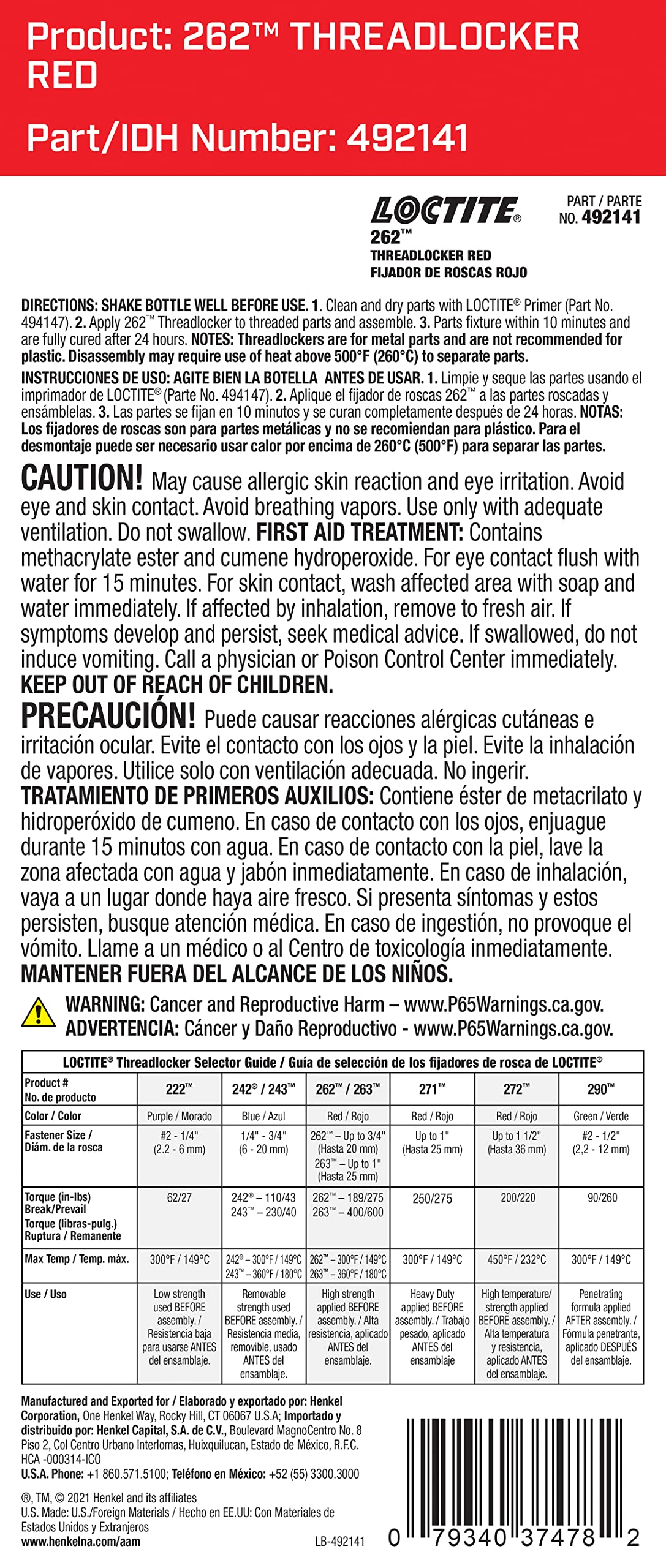 The LOCTITE Automotive Threadlocker Red 262 is a high-strength, high-temp adhesive designed for permanent locking of threaded metal components. This 36 ml threadlocker is OEM-approved and trusted by professionals in engine building and repair, rigorously tested by leading auto manufacturers. It provides reliable metal adhesion, effectively bonding all metals, including passive substrates like stainless steel and aluminum, with superior oil tolerance for a stronger connection. Engineered for durability, it secures parts subjected to heavy shock, vibration, and extreme chemicals, while remaining easily removable with localized heat and basic hand tools. Versatile in application, its ideal for air tools and assembly tasks involving cylinder block bolts, ring gear bolts, and transmission shaft bolts, suitable for fasteners up to (19 mm) before assembly. The quick-setting formula cures in just 5 minutes, achieving full strength within 24 hours for efficient and reliable results.