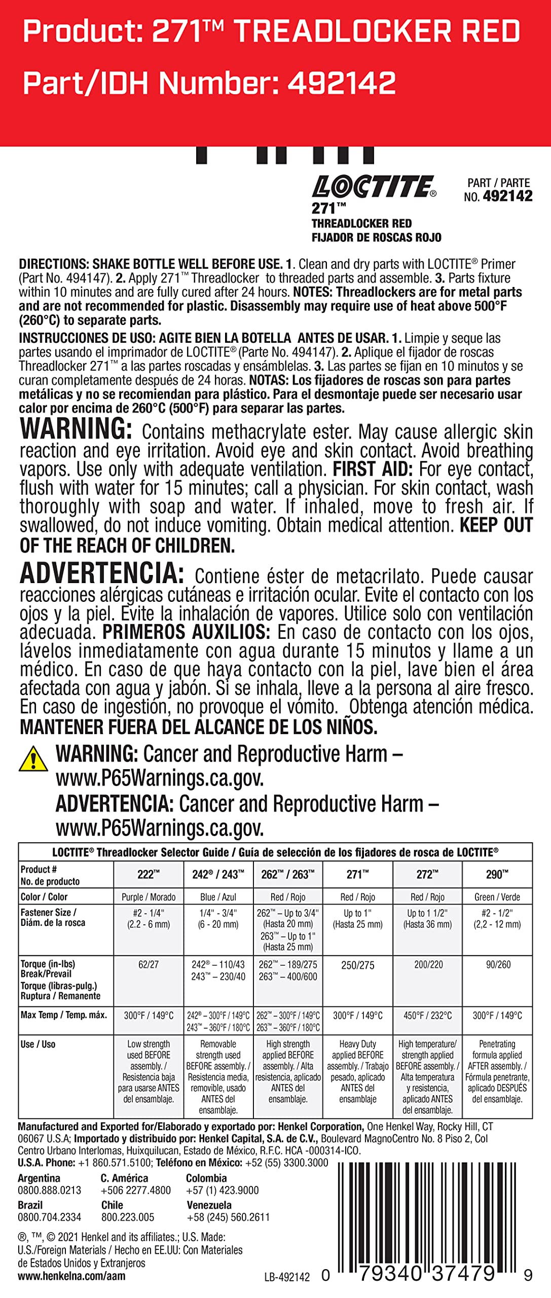 LOCTITE Automotive Threadlocker Red 271 is a high-strength, high-tempe adhesive designed for heavy-duty applications where durability and reliability are critical. OEM-specified and trusted by professionals, this anaerobic threadlocker bonds effectively to all metals, including stainless steel, aluminum, and plated surfaces. Its enhanced oil tolerance ensures superior performance in challenging conditions. LOCTITE Red 271 is engineered to secure components exposed to heavy shock, vibration, and extreme chemical environments, making it ideal for use on frame brackets, suspension fasteners, shock absorber mounts, and wheel studs. It is best suited for large bolts and studs with diameters of 1 inch (25 mm) and larger. The threadlocker sets in just 10 minutes and reaches full strength in 24 hours, providing a durable, temperature-resistant bond up to 140F. Disassembly is easy with localized heating and hand tools. Whether you're working on automotive or industrial applications, LOCTITE Red 271 delivers professional-grade performance and long-lasting results.