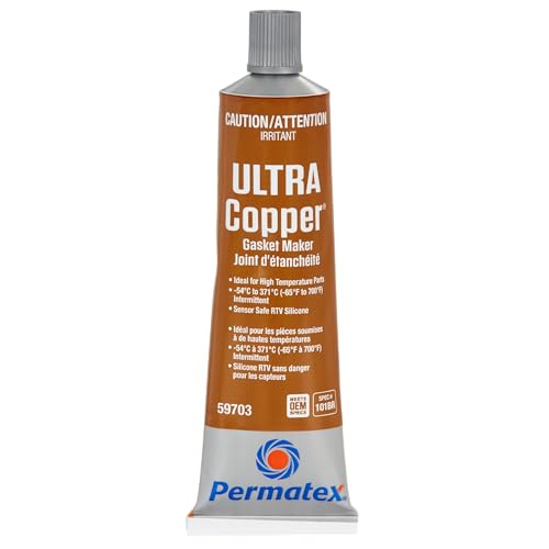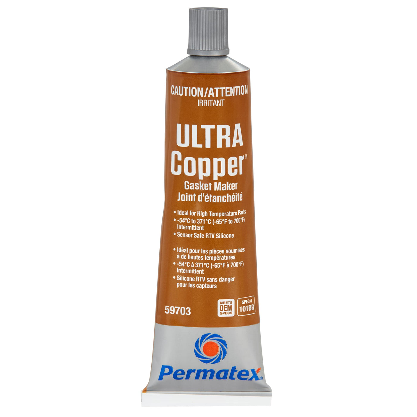 Ideal for high temperature parts. -54 degrees C to 371 degrees C (-65 degrees F to 700 degrees F) intermittent. Sensor safe RTV silicone. Meets OEM specs. Spec 101br. Ultra Copper Gasket Maker maintains seal integrity in the highest temperature applications up to 371 degrees C (700 degrees F) intermittent. High performance. Sensor safe. Non-corrosive. Temp Range: -54 degrees C to 316 degrees C (-65 degrees F to 600 degrees F) Continuous, 371 degrees C (700 degrees F) intermittent. Superior oil resistance. OEM specified. Excellent adhesion. Applications: Exhaust manifolds/headers, turbochargers, valve covers, oil pans, timing covers, water pumps, thermostat housings. www.permatex.ca. Assembled in U.S.A. with U.S. and global materials.