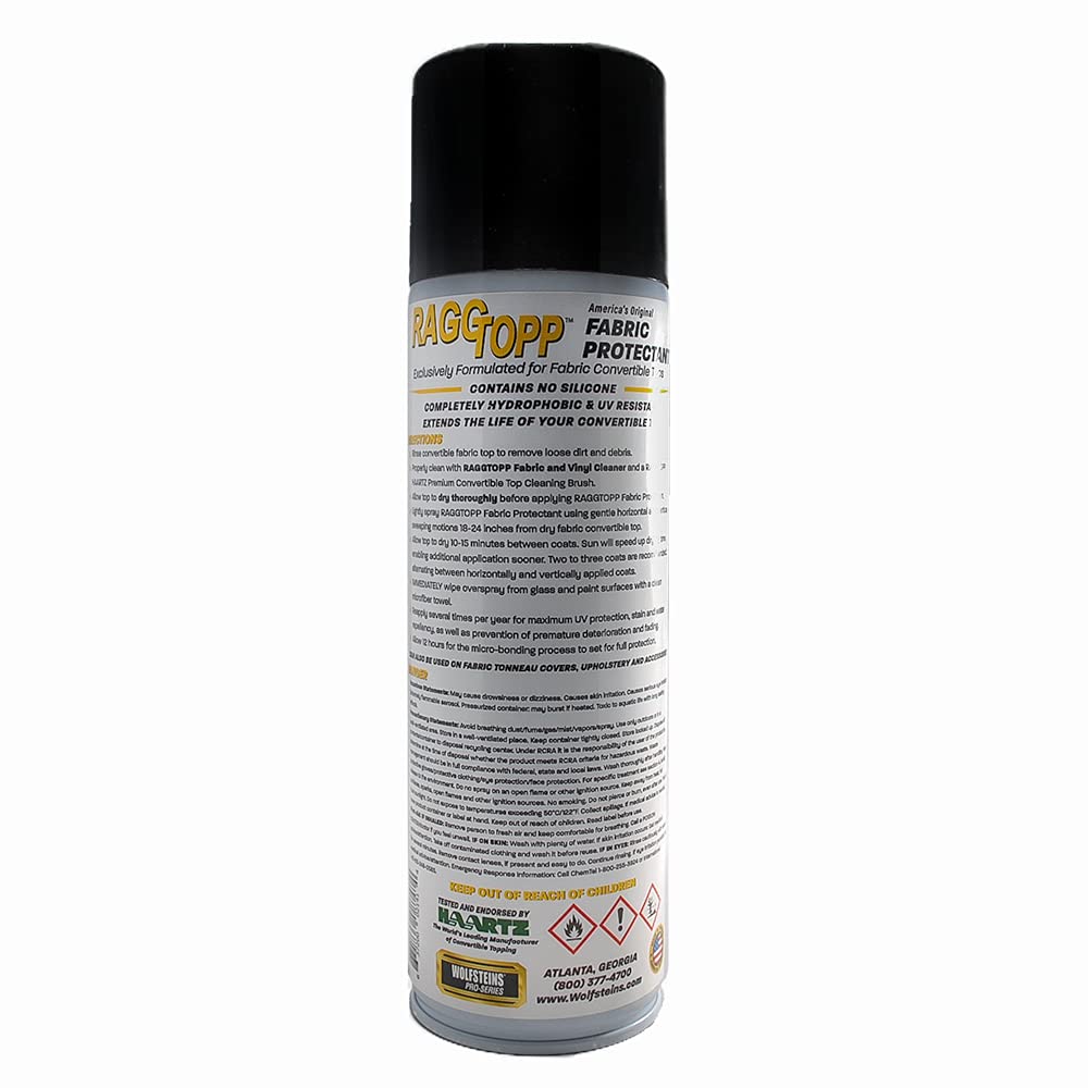 Raggtopp 2141 Farbric Protectant (4 Pack) 14 Oz. Aerosol Can Especially Developed For The True Convertible Top Professional And Enthusiast To Protect And Maintain Fabric, Vinyl Soft Tops, And Plastic Windows From Harmful Elements. Patented Formula Protects By Keeping Out Environmental And Human Contaminants. Renews And Extends Fabric And Carpet Life. Restores Lost Water And Stain Repellency. Contains No Silicone. Provides Uv Protection With Uv Stabilizers. Meets And Exceeds California Voc Air Quality Standards Raggtopp Protectant Was Developed For The True Convertible Top Professional And Enthusiast To Protect And Maintain Their Fabric, Vinyl Soft Tops And Plastic Windows From Harmful Elements. Designed To Restore Fabric From Deteriorating That Happens From Uv Rays, Acid Rain, Smog, Bird Dropping, Salts, Tar, Dirt, Grease, And Other Grime. Raggtopp Protectant Is The Choice In Convertible Top Protection. A Polymer Formula That Creates A Superior Protective Barrier That Micro-Bonds To The Convertible Top And Protects From The Elements. Proper Application: Apply To A Clean Dry Fabric Top. For Professional Results, Shake Well To Keep Product Mixed. Spray Twelve Inches From The Convertible Top Using Gentle Overlaying Sweeping Motions. Spray Extra On Seams. Do Not Saturate. Allow To Dry 10-15 Minutes Between Coats In The Sun. Artificial Heat Can Be Used To Speed Drying Time. Warning: This Product Can Expose You To Chemicals Which Is [Are] Known To The State Of California To Cause Cancer And Birth Defects Or Other Reproductive Harm.