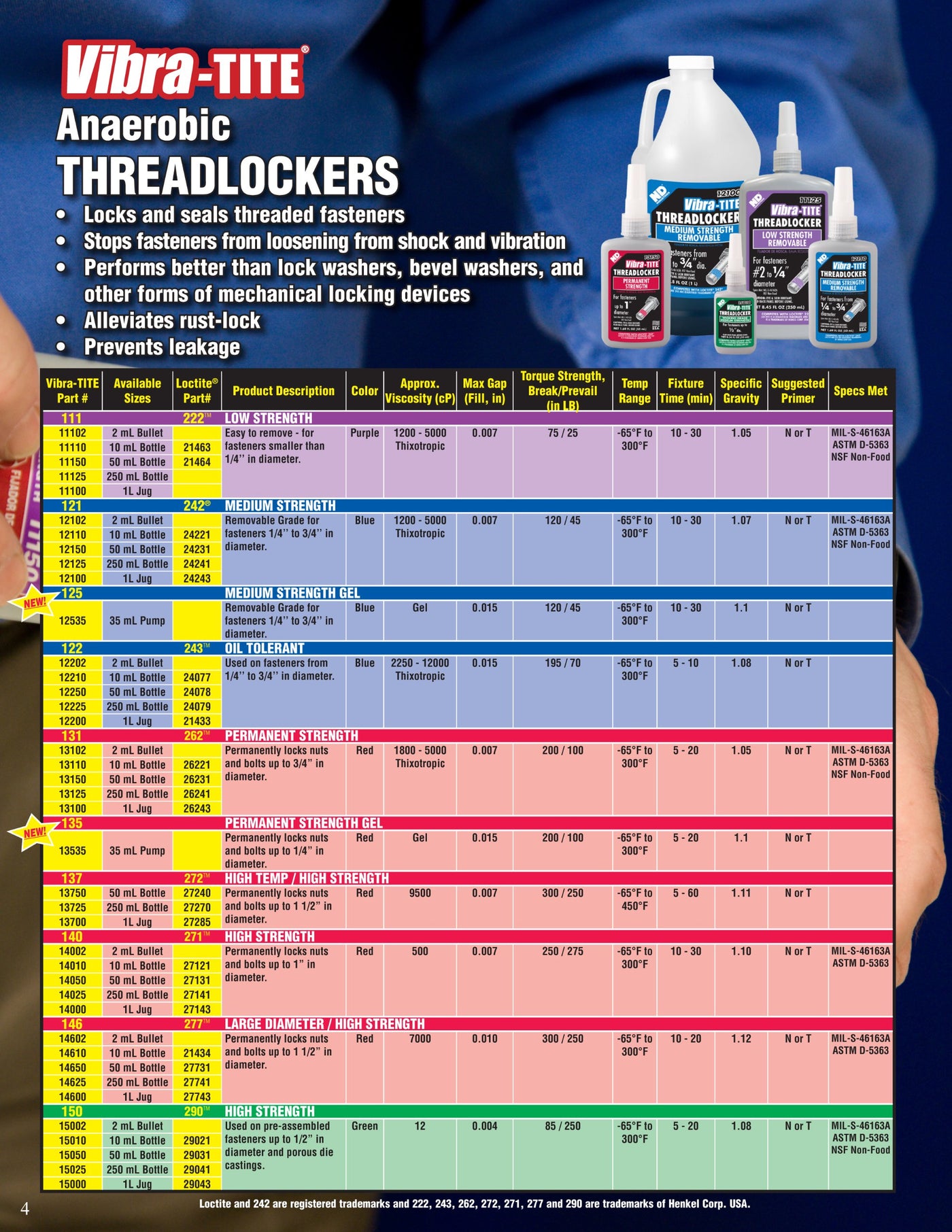 Vibra-TITE 121 Medium Strength Threadlocker is a general purpose product. 121 will hold all metric, imperial or conventional sized nuts and bolts, meeting the requirements of over 80 percent of fastening applications. It does not run off or drip and does not migrate after assembly due to its thixotropic chemistry. Once applied, parts install easily, lubricated by the adhesive. Vibra-TITE 121 replaces lock washers, plastic inserts and locks machine access bolts, and hydraulic system bolts. Used on gear box bolts, drive shaft fasteners, bearing cover cap screws, counter sunk screws, conveyor roller bolts and construction equipment. Ensure parts are clean, dry and free from oil and grease before use. Product is normally hand applied from the bottle onto threaded parts. Fixture Speed without Primer is 20 minutes at 77/F. Shelf Life is 12 months at 68 degree F. 24 hours at 68 degree F Full Cure Time. 100-200 inches/lbs Typical Breakaway Strength. 30-60 inches/lbs Typical Prevailing Strength. Product should be stored in a cool and dry location at temperatures between -10 degree C to 30 degree C. Optimal storage is 22 +/- 4 degree C. Shelf life is 18 months from date of manufacture when stored at 22 +/- 4 degree C. Seals nuts and bolts ranging from 1/4'' to 3/4'' (6-20mm) in diameter while allowing disassembly using standard tools. 0.007 inches Maximum gap fill. 120/45 lbs Torque strength, Break/Prevail. 1.07 Specific gravity. N or T Suggested primer. 50 ml Bottle.