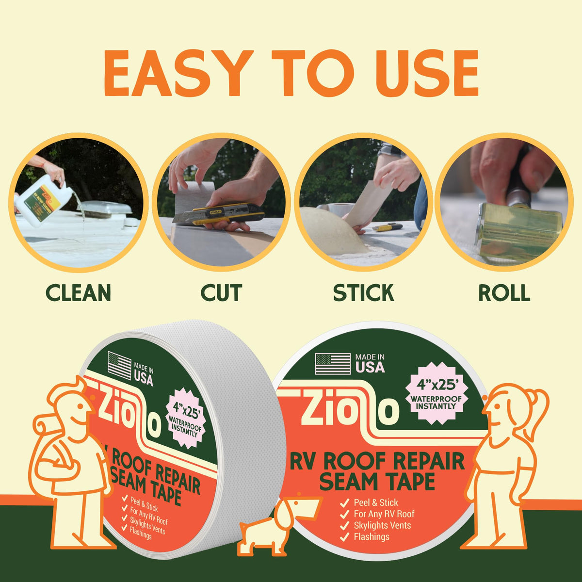 YOUR ROOF'S NEW BEST FRIEND, LEAKS' WORST ENEMY Remember why you bought your RV? It wasn't to become an amateur roof technician tracking down mysterious drips. Ziollo's RV Roof Repair Seam Tape puts those worries in your rearview mirror. Unlike ordinary roof sealant waterproof products that take hours to apply and days to cure, our peel-and-stick solution creates an instant watertight seal right where water wants to sneak in-along seams, around vents, and at flashing tape edges. It's basically a superhero cape for your roof's most vulnerable spots. Our premium 4-inch wide by 25-foot long butyl sealant tape outperforms competition with superior adhesion in scorching deserts or chilly mountain passes. Meanwhile, the bright white finish reflects sunlight, helping keep your RV cooler in summer-unlike that dark eternabond tape that turns your roof into a heat magnet. Complete your roof's defense system with our full lineup: start with Ziollo RV Roof Cleaner (because dirt isn't a proper base layer), use this seam tape for reinforcement on trouble spots, seal all remaining edges with Ziollo Lap Sealant, and for the ultimate shield, top with our 100% Silicone Roof Coating. From weekend warriors to full-timers, Ziollo has your roof covered. One roll tackles 25 linear feet of potential leak zones, so you can fix most camper roof sealant issues with minimal fuss. Plus, the included seam roller means perfect application every time. Stop playing detective with mysterious ceiling stains and start planning that cross-country trip. Because the only thing that should be dripping at your campsite is the s'mores chocolate on your fingers. Make the good times roll with Ziollo-less maintenance, more memories!