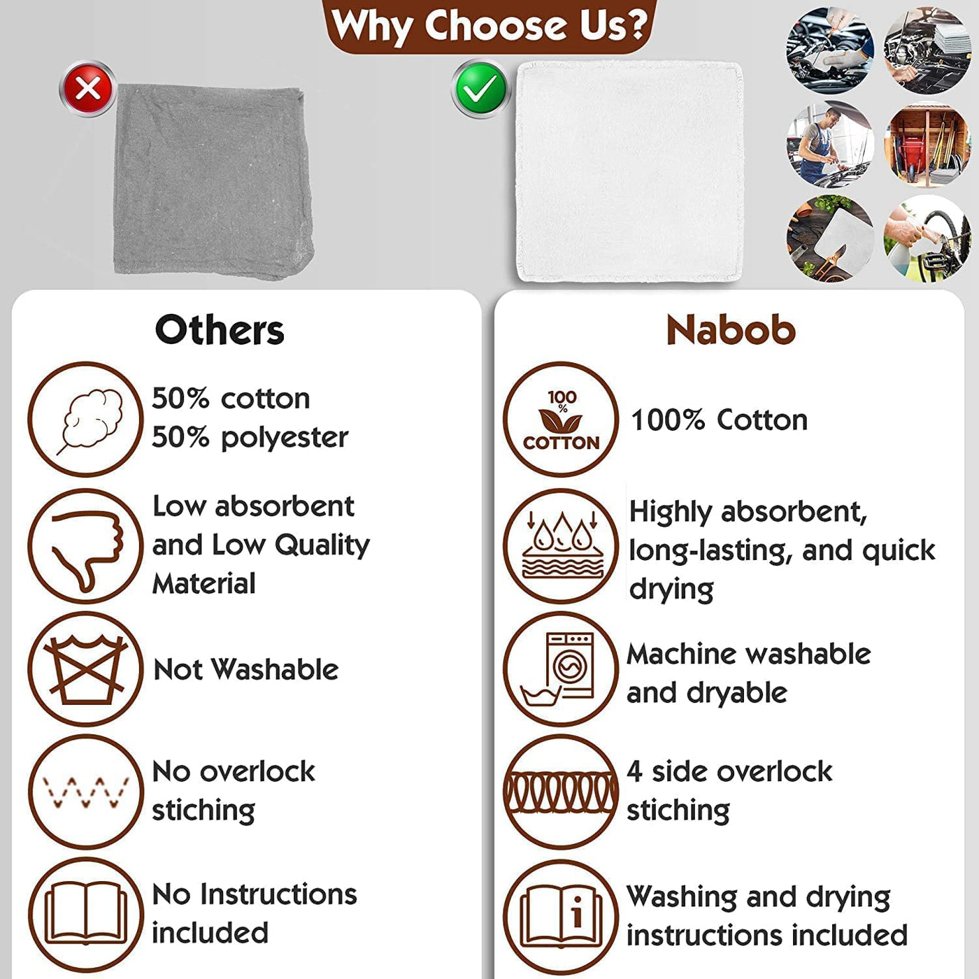 Get The Most Value For Your Money With Nabob Auto-Mechanic Detailing Shop Towel Rags! The Nabob 100% Cotton Auto-Mechanic Detailing Shop Towel Rags Is A Popular And Economical Option For Home Or Professional Car Care. Absorbent, Reusable, And Hemmed For Extra Strength, They Are Perfect For Wiping Up Oil, Grease, And Lubricants. Over-Locked Towel Edges Ensure Durability, And 100% Cotton Fabric Stands Up To Multiple Machine Wash And Dry Cycles. 100-Pack Shop Towel Why Purchase Nabob Wipers Shop Towel? Because Automotive Clean-Up Tasks Are Easier With The Nabob Wipers Shop Towel. This Cleaning Pack Is Designed For All Types Of Car-Related Activities, From Changing The Oil To Refilling Fluids, As Well As General Automotive Maintenance Work. Keep These Shop Towels In Your Garage, Around The House, Or On The Job For A Quick And No-Fuss Solution To Any Mess. They Are Strong And Absorbent To Clean Up Grease, Oil, Grime, And Other Fluids Perfectly Sized 14X14 Inches 100% Cotton For Superior Strength Suited For Your Toughest Automotive & Garage Clean-Up Tasks Suited For Changing Motor Oil, Refilling Fluids, And Other General Automotive Maintenance Activities Perfect For Use In Home Or Professional Garage A Grade Quality P.S. These Shop Towels Do Not Replace Your Kitchen Or Home Towels If You Need To Purchase Kitchen/Bath/Salon Towels.