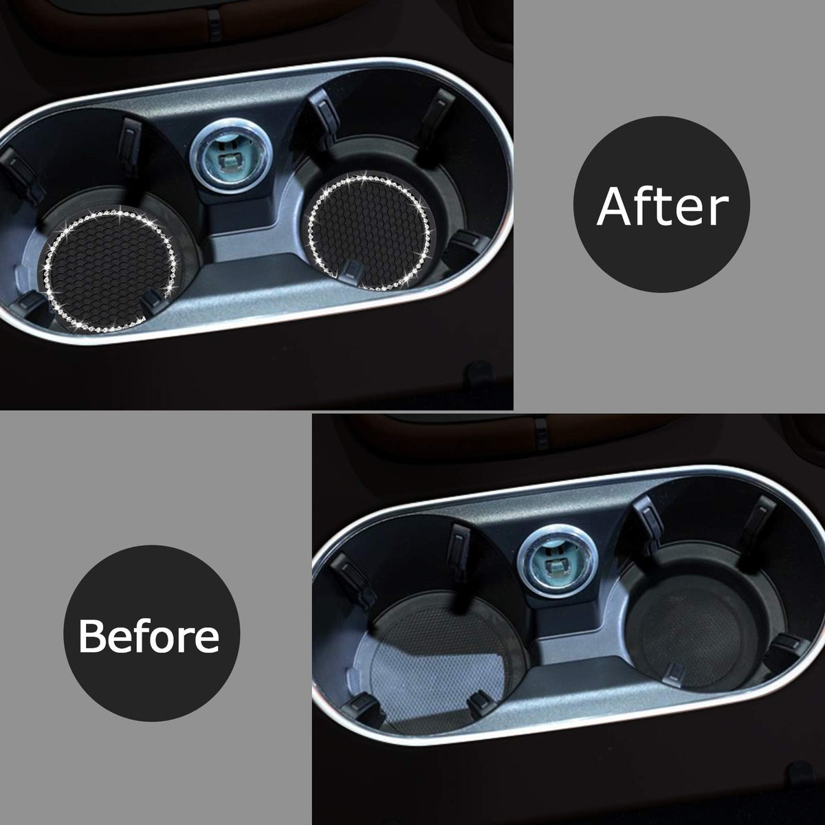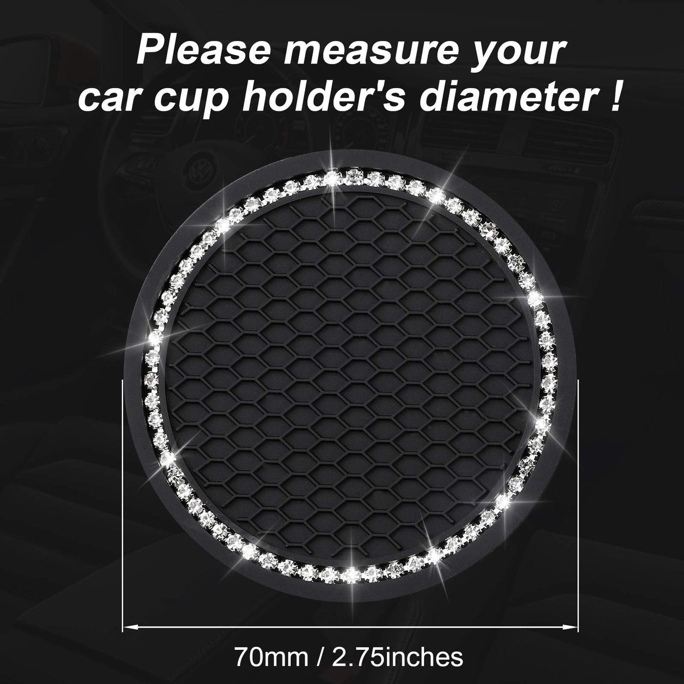 Our 2021 new Bling Crystal Rhinestone Design Car Interior Accessories Universal Vehicle Cup Holder Insert Coaster has an elegant and simple design, which not only brings convenience to your journey, but is also an exquisite gift! Made of premium quality silicone, durable and withstand high temperature without peculiar smell Protect your cup holder from the damage of condensation fluid and stains Not only enhance interior look of your car, but also keeps your vehicle clean and tidy Note: The diameter is 2.75 inch, please check the diameter of Your Car's Cup Slot before buying to ensure that our Bling Car Cup Coaster fits your car perfectly.We are so confident that you will be 1100 Percent satisfied that we are offering you a 90 days . If for any reason you are not happy with your purchase, contact us and we will give you a replacement, no question asked. Have a risk free purchase today!