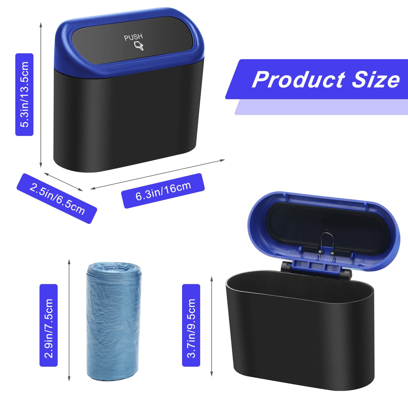 Package includes Car trash can small*1piece Garbage bag*1 roll (30 garbage bags) Trash bin size length: 6.3in/16cm height: 5.3in/13.5cm width 2.5in/6.5cm The size of each garbage bag is 30*35cm