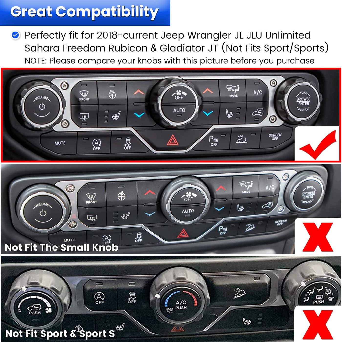 Custom Fit - Perfectly fit for 2018 2019 2020 2021 2022 2023 2024 2025 Jeep Wrangler JL JLU Unlimited Sahara Freedom Rubicon and Gladiator JT 2-door and 4-door (Not Fits Sport/Sports). Please compare your knobs with our picture before you purchase.