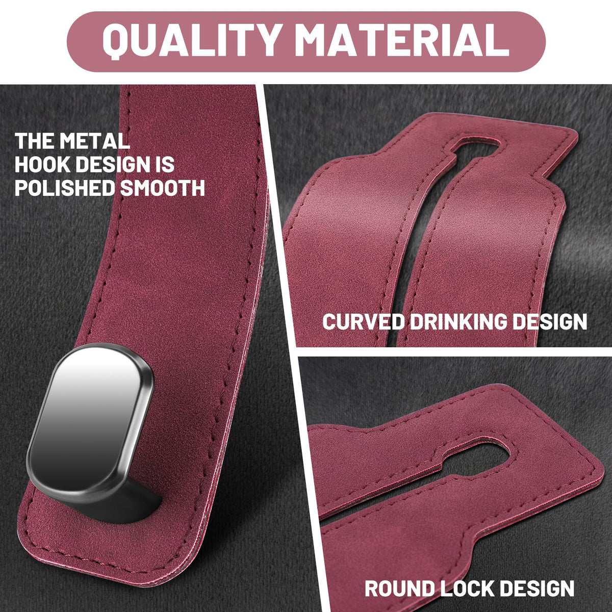 Q: What materials are used in the construction of these car hooks?A: The Amelity Headrest Hooks are made from high-quality leather material, ensuring durability and wear-resistance. They also feature strong metal hooks for enhanced load-bearing capacity.