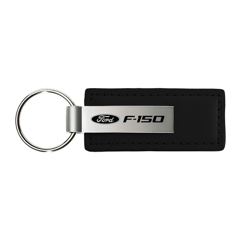 Q: What material is the Au-Tomotive Gold Ford F-150 keychain made of?A: The Au-Tomotive Gold Ford F-150 keychain is made of genuine black leather and features a hinged steel key holder for durability.