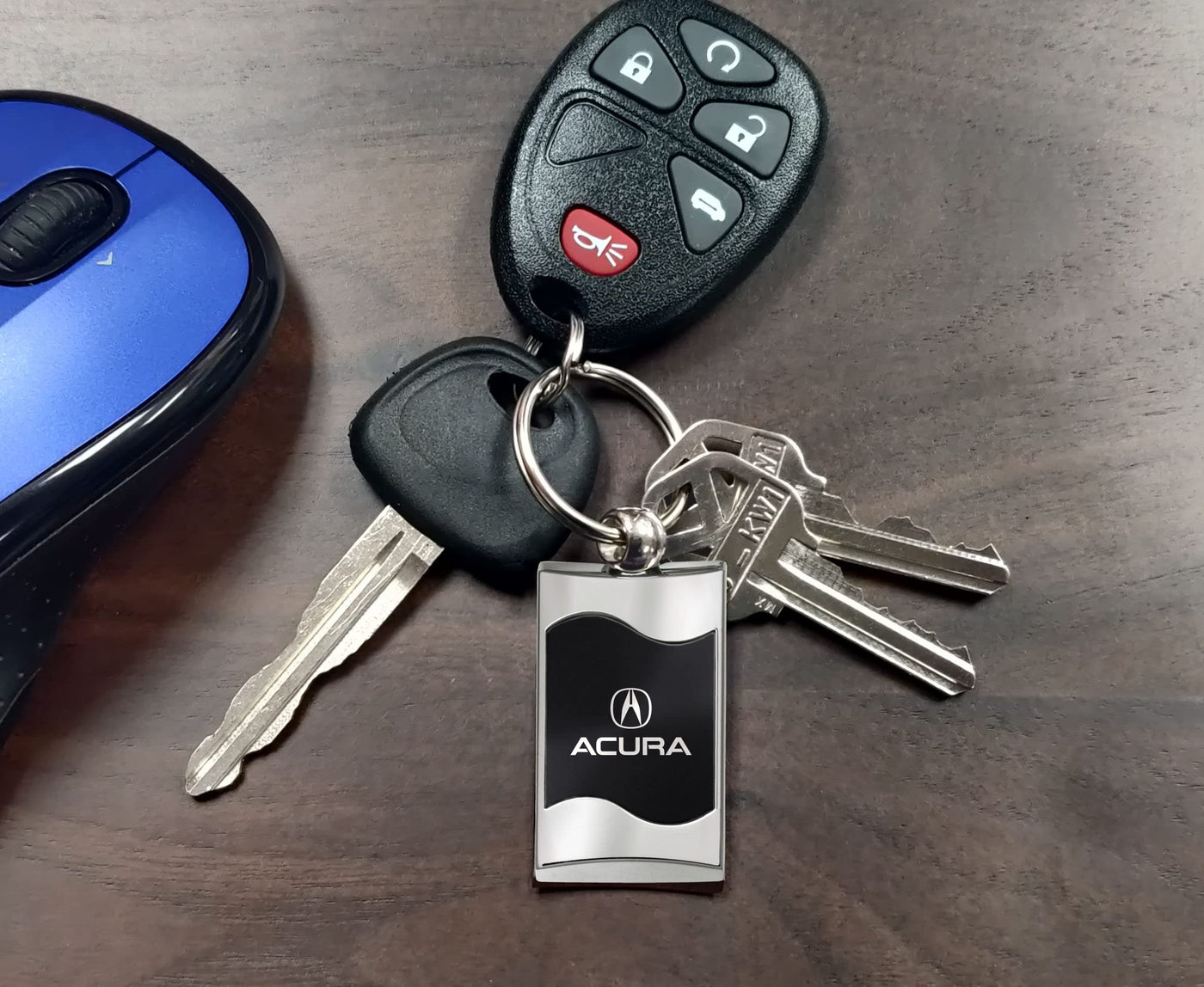 Q: What makes the Au-TOMOTIVE GOLD Rectangular Wave Key Fob unique?A: The unique wave appearance of the colored face and the shiny chrome keychain distinguish the Au-TOMOTIVE GOLD Rectangular Wave Key Fob, making it a stylish accessory for your Acura.