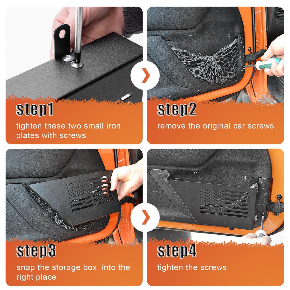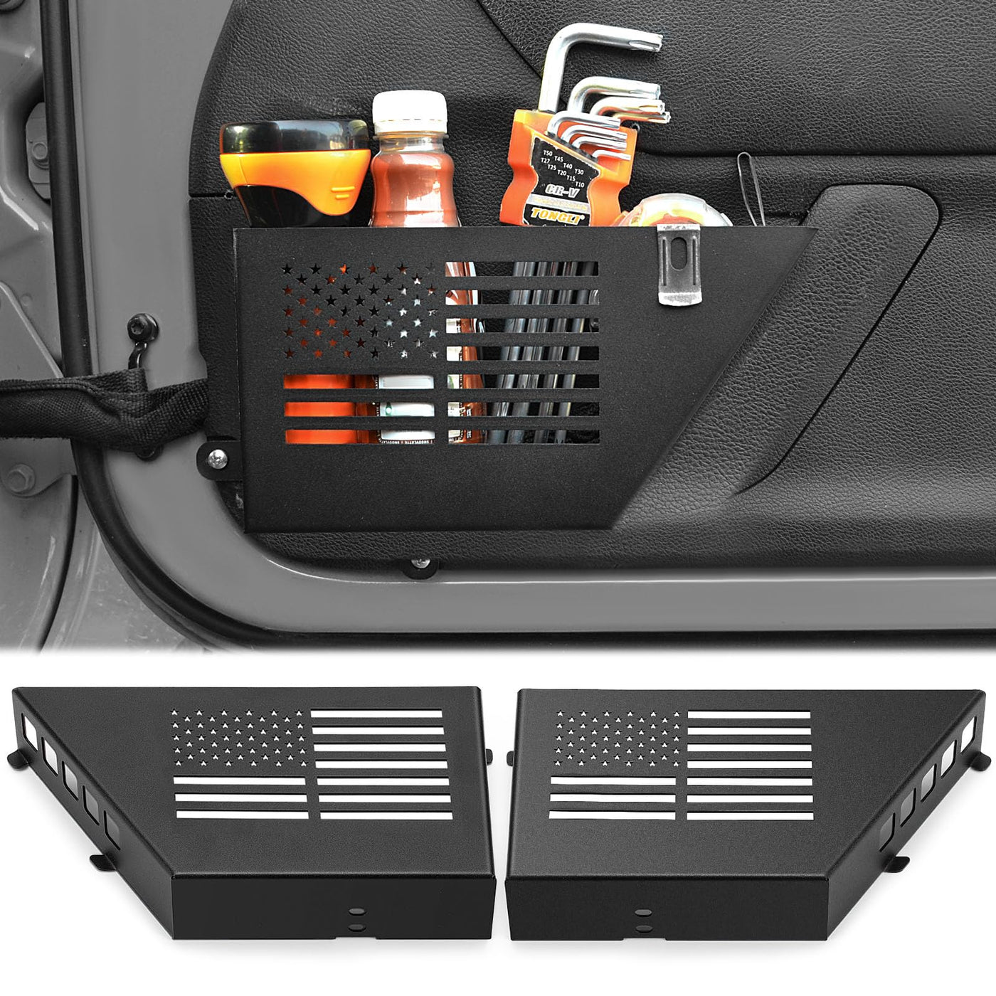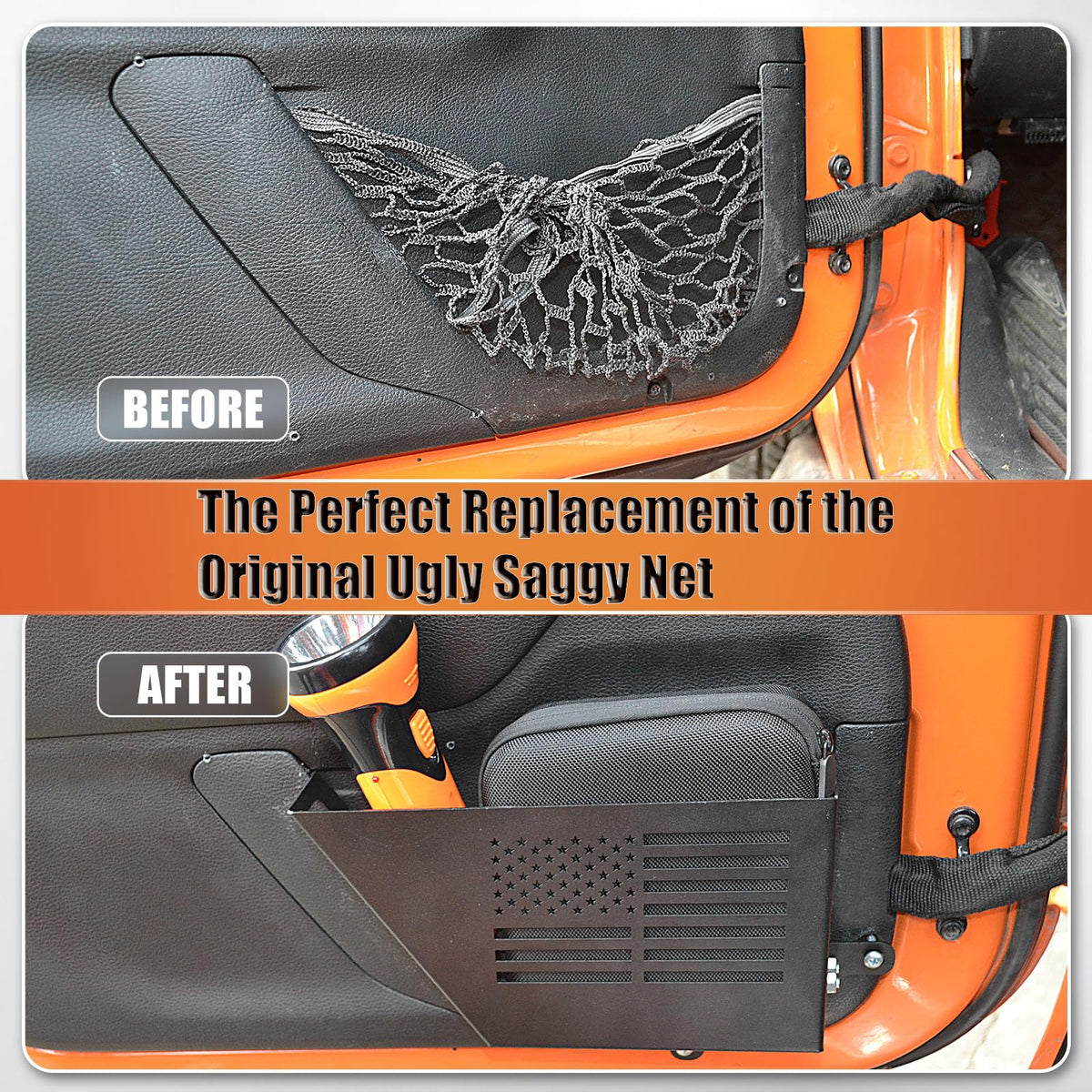 Q: How do the CALBEAU Front Door Pockets improve my Jeep's interior?A: The CALBEAU Front Door Pockets enhance your Jeep's interior by providing a more organized storage solution than the original saggy net. They add a rugged and stylish look to your vehicle while offering practical storage options.