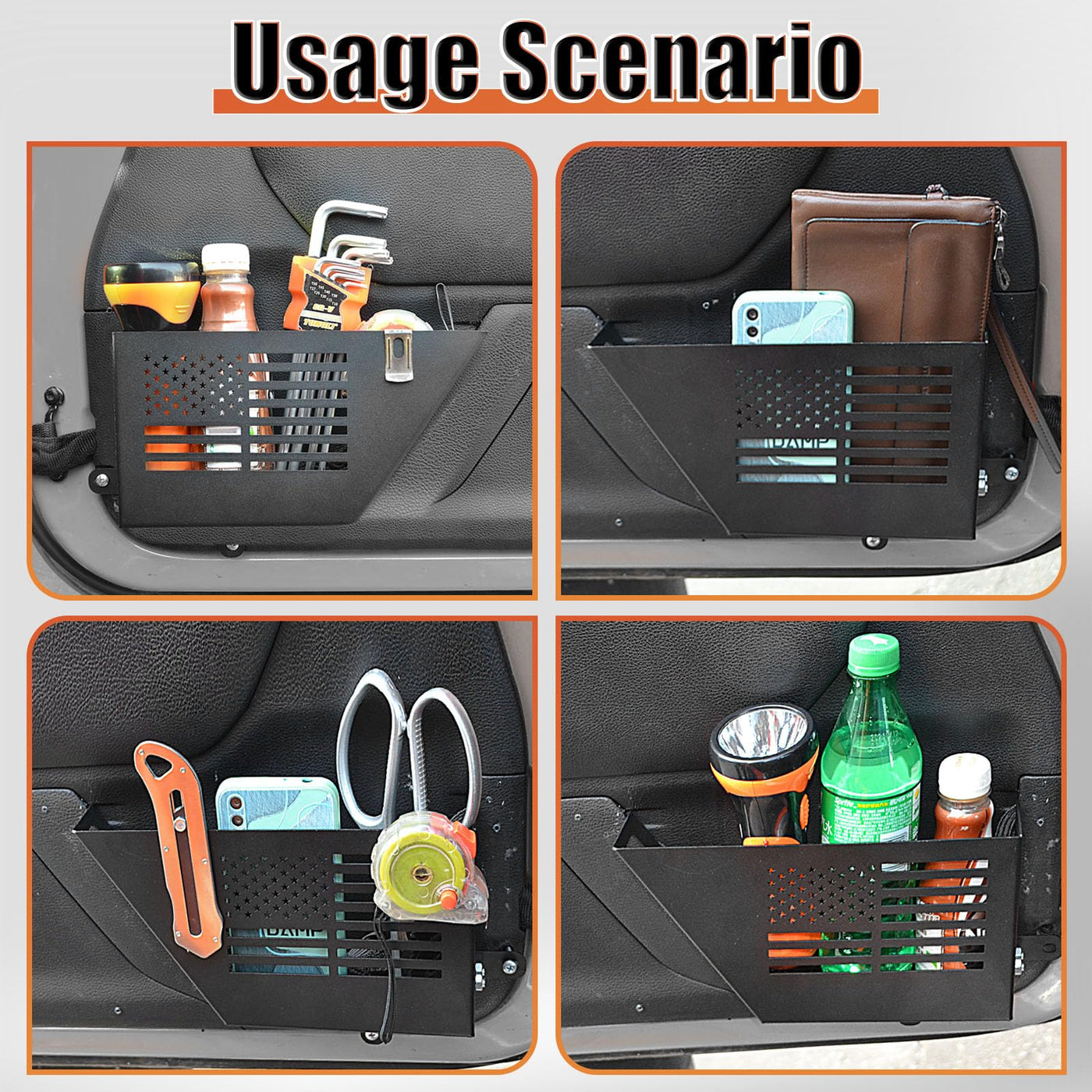 Q: What items can I store in the CALBEAU Front Door Pockets?A: These door pockets provide extra storage space for various items such as your phone, wallet, driver's license, flashlight, and tape measure. They are a perfect replacement for the original saggy netting.