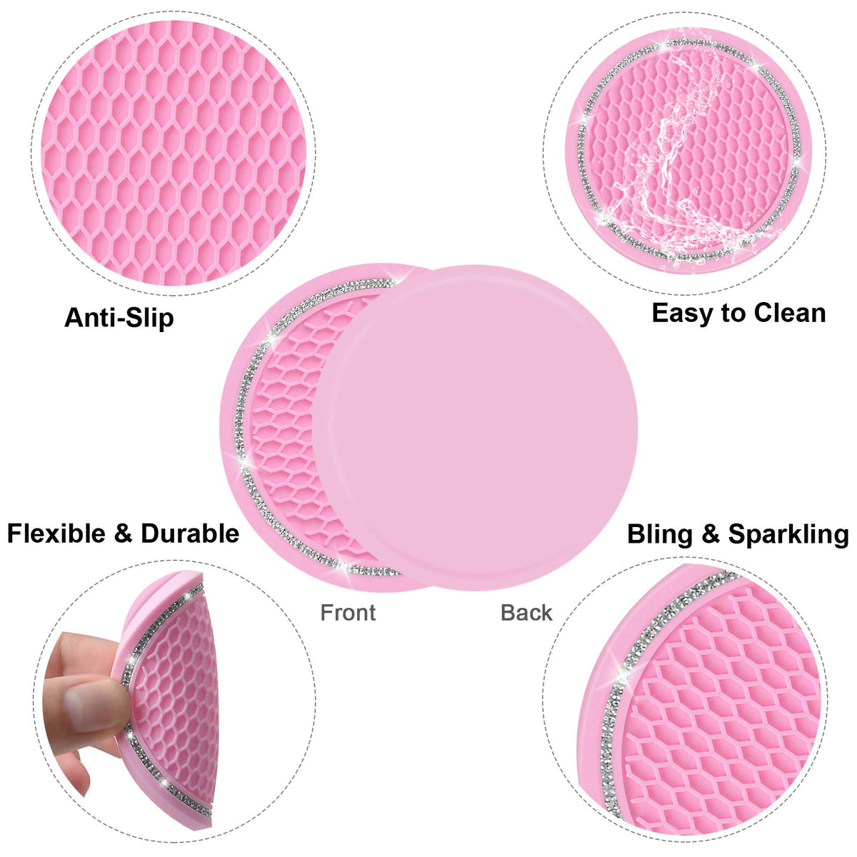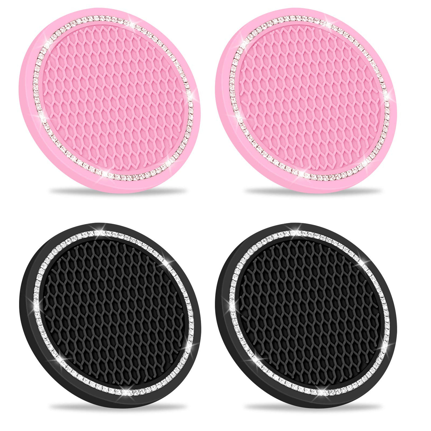 High quality material: The Car coasters is made of rubber soft and bendable and not easily deformed.Super cute car coaster: 2.75 inches diameters soft car cup holder coaster fit 99% car in the market. It's classy looking help to keep your drinks sturdy.Easy to install & easy to clean: It's easy to install and clean by being silicone.They fit perfectly in the cup holder circle you don't need any type of adhesive or anything you just drop them in and they stay put there are absolutely adorable they match with all my other rhinestone accessories in the car. You can remove them at anytime, if you don’t want to use it.Best gift: This is not only a nice little touch up to our vehicle,but also the best gift for family and friends. It can add a warm atmosphere to their car and warm up your feelings.Universal Compatibly: Widely used for Ford, Buick, Mazda CX-7, CX-5,Nissan Honda Civic sedan, Toyota and most cars.